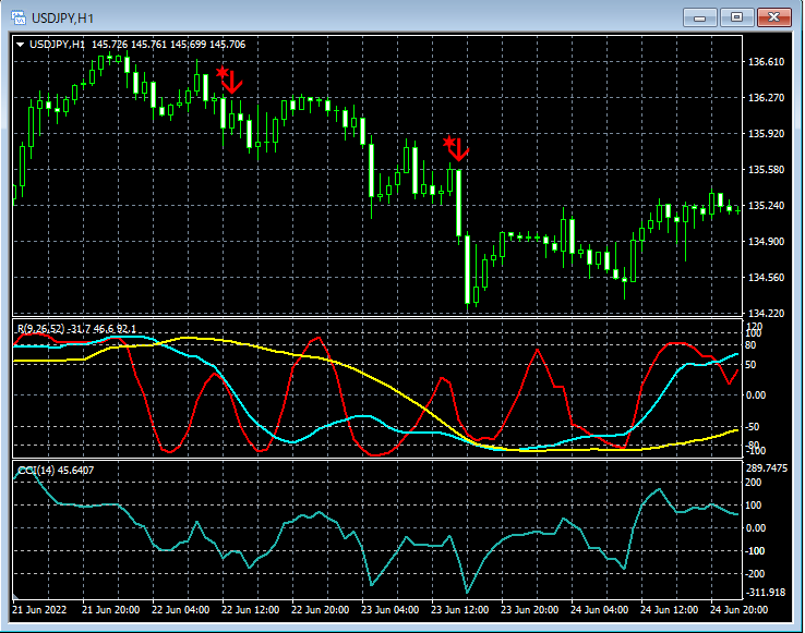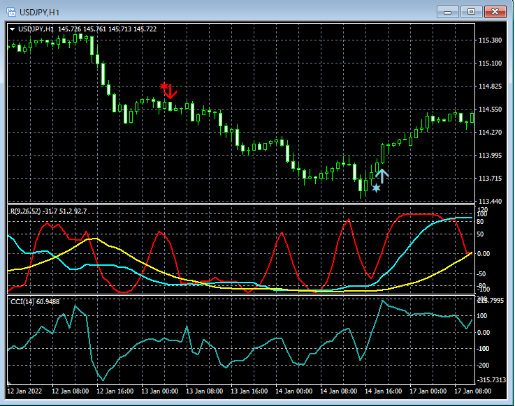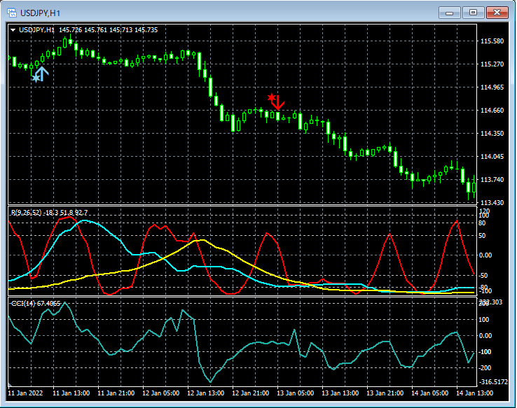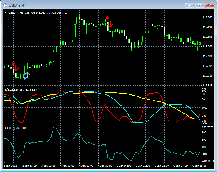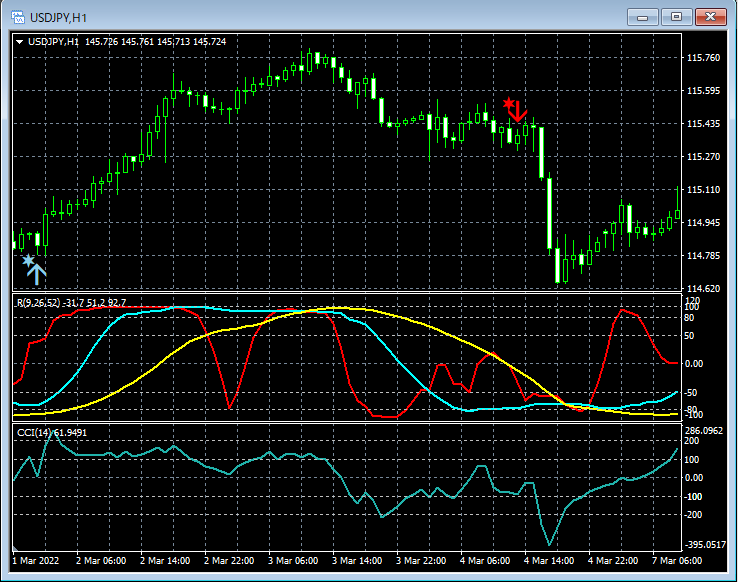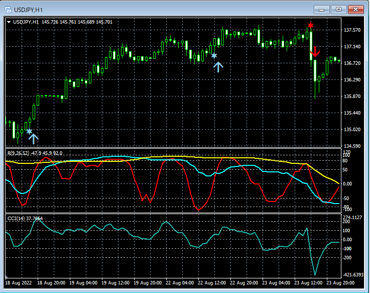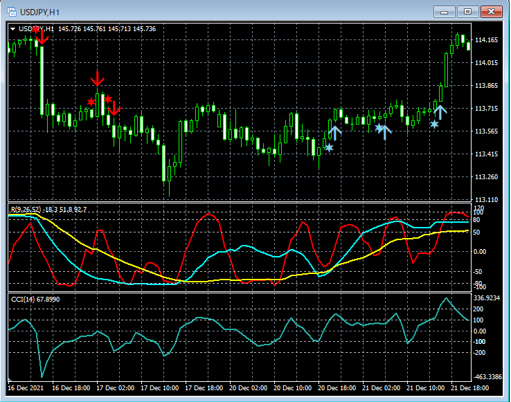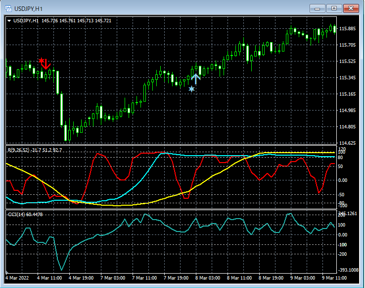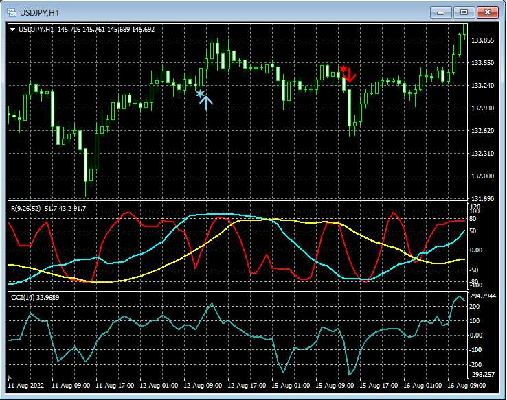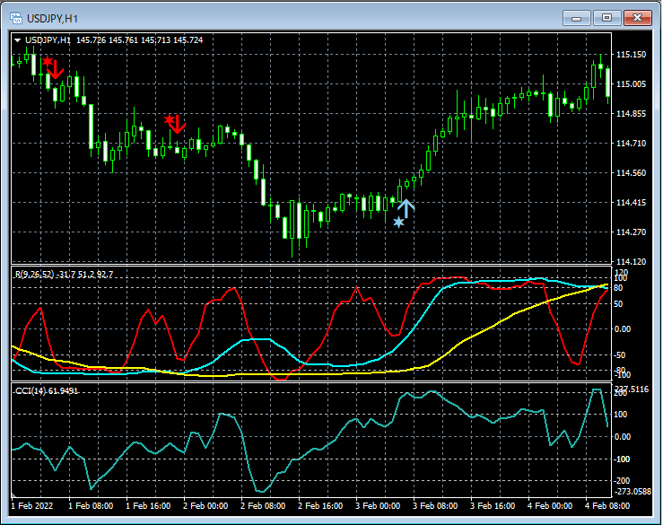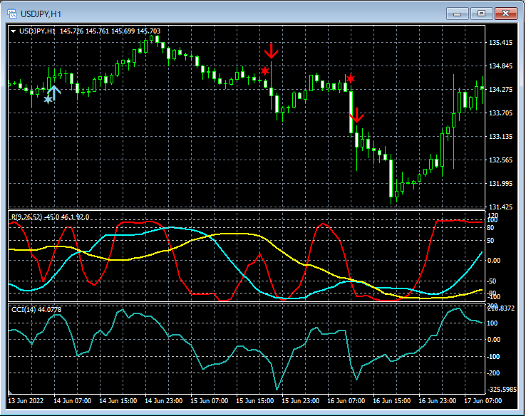 そして、あるローソク足の終値レベルで赤色の星印の点灯が確定すると、その次のローソク足の寄り付きと同時に赤色の矢印が点灯します。