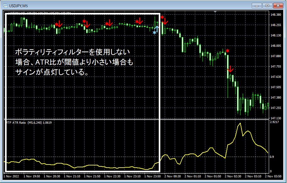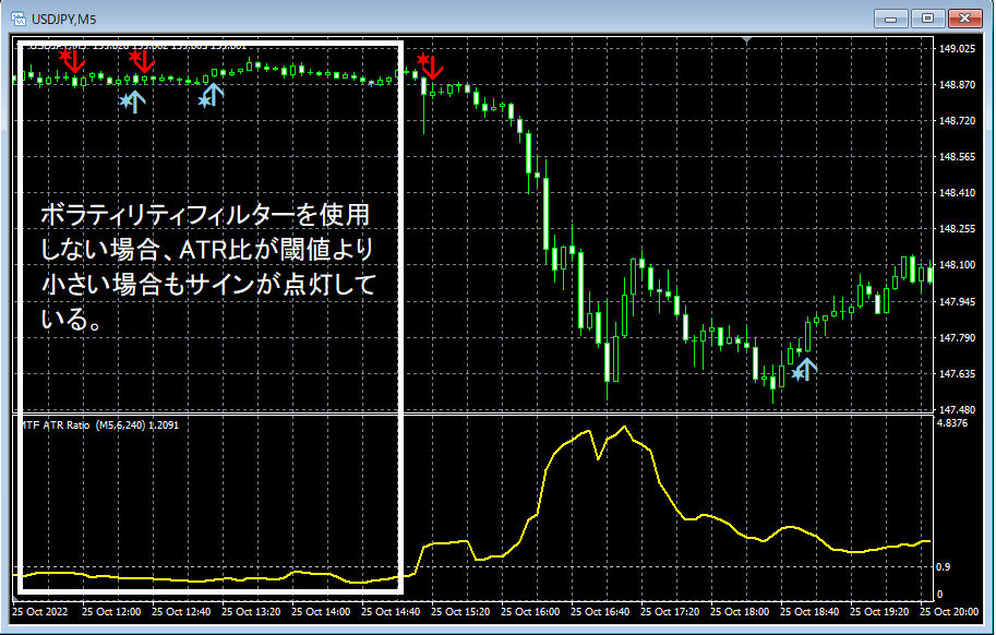 ボラティリティフィルターを利用する場合、ATR比が指定した閾値(ATR_Ratio_Level)より大きい場合のみサインが点灯します。