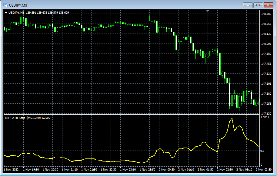 本商品には、ATR比(短期ATR/長期ATR)を表示するインジケーター MTF_ATR_Ratio_XXXXXXXX.ex4 が付属しています。