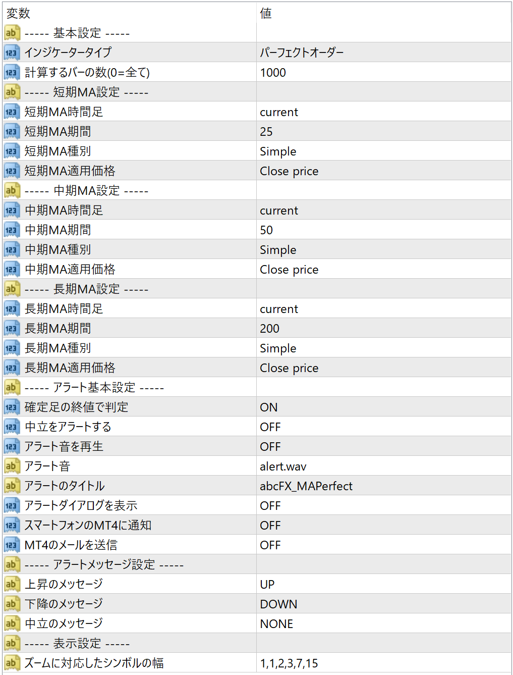 「インジケータータイプ」を「パーフェクトオーダー」に設定すると、パーフェクトオーダを判定します。「方向」に設定すると移動平均線の向きを判定します。
