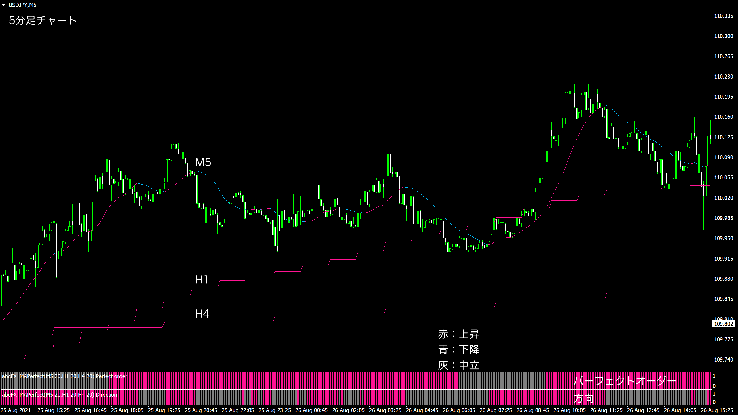 下図は5分足チャートに、5分足期間20、1時間足期間20、4時間足期間20の移動平均線のパーフェクトオーダーをサブウィンドウ1に、方向をサブウィンドウ2に表示しています。