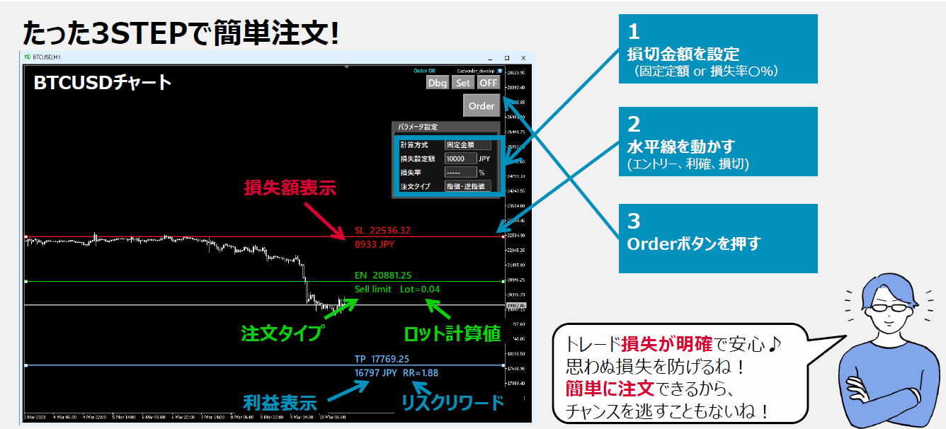 ・水平線を動かすだけで、ロスカット金額を指定してロットを自動計算します。
