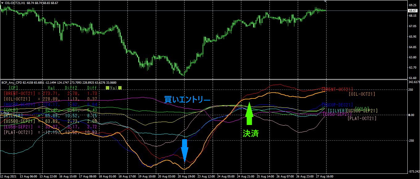 CFD8本のチャートが収束している状態から、OIL-OCT21が次第に広がってきて、最も下に乖離してきました。