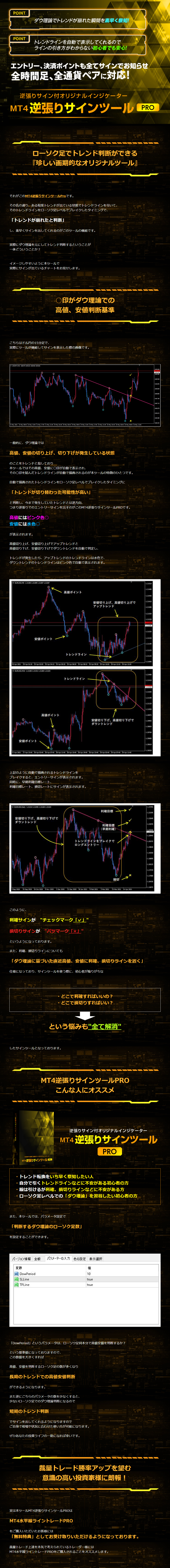 ダウ理論でトレンド転換したタイミングでエントリー、利確/損切りポイントにサイン表示!トレンドライン自動表示で視覚的にも分かりやすい!逆張りサイン付オリジナルインジケーター