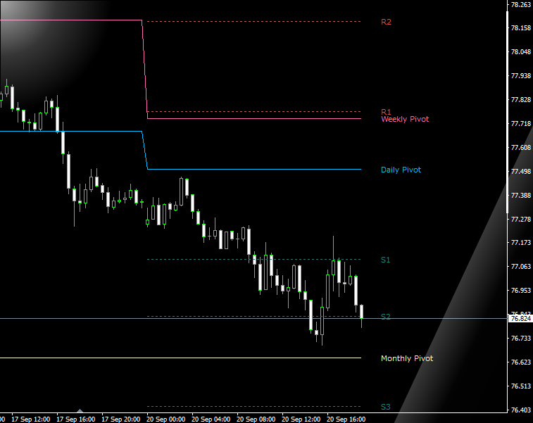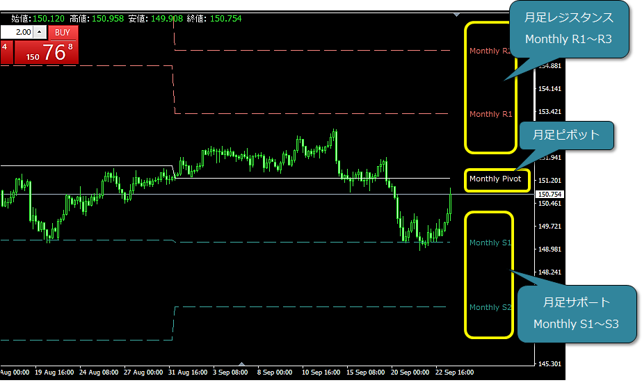 前月の月足をもとに算出されることを除けば、日足ピボットと同様の考え方です(月足が確定するまでの1ヶ月間有効です)。無料