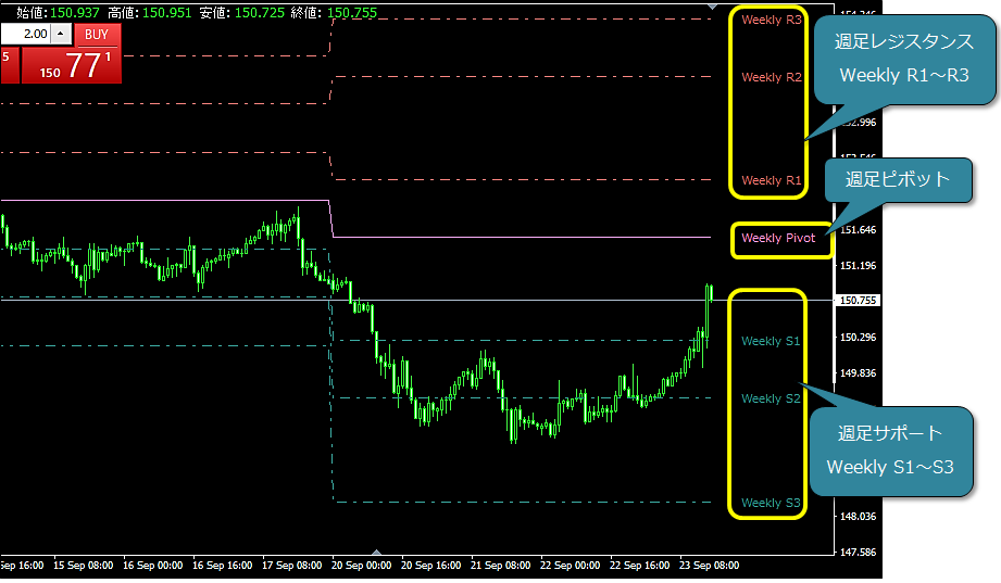 前日の日足をもとに算出されるラインです(当日のみ有効です)。 デイトレードの基準とも言えるラインで、多くの投資家がこのラインを見ています。 ピボットラインを中心に、上側のエリアに価格がある時は「強含み」、下側のエリアでは「弱含み」と考えます。 各レジスタンスライン(R1~R3)、サポートライン(S1~S3)での反発を確認してからの逆張り、 又は抜けの勢いを確認して順張りを行います。 特にR3、S3を抜けた場合は、その方向にブレークしたと考えます。週足ピボット(Weekly Pivot)