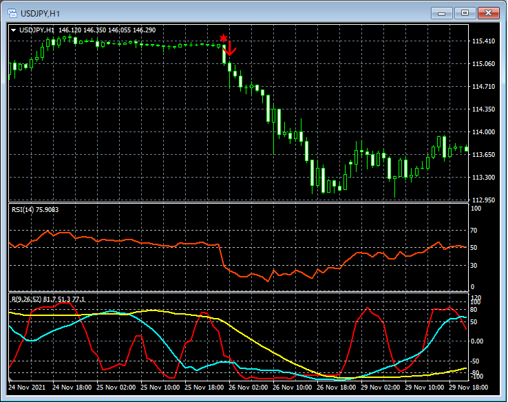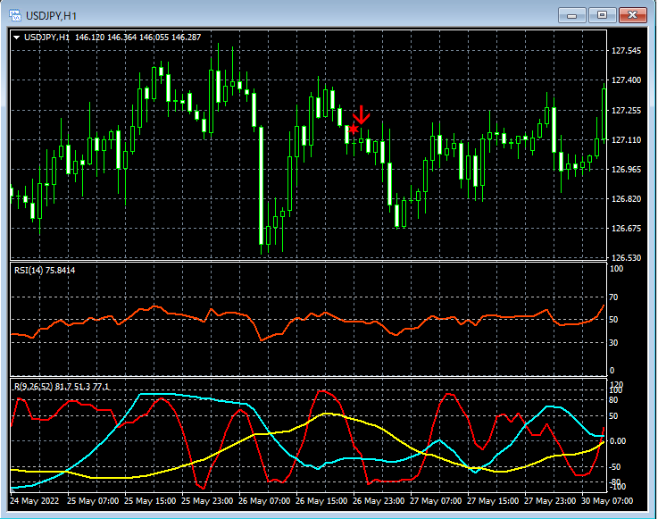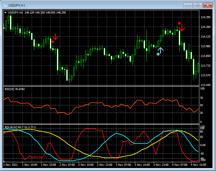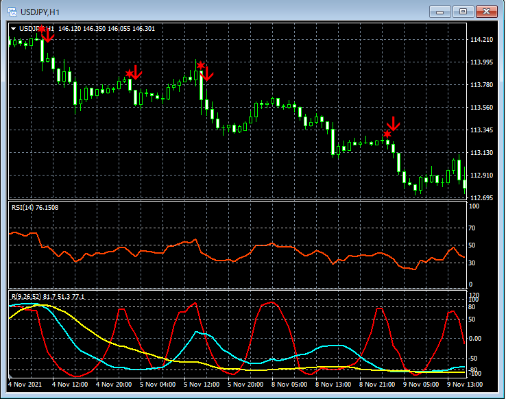 RCI3本ラインが下向きにそろっていない状態にあるローソク足の次のローソク足でRCI3本ラインの方向が下向きにそろった時に、RSIが50ラインより下にあるならば、赤色の星印が点灯します。