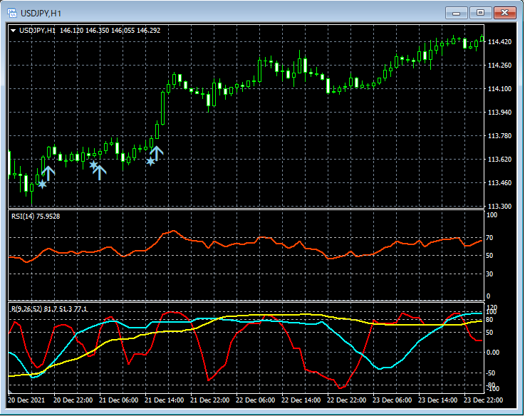 ※RCIFilterを使用している場合には、直前のローソク足における短期RCIの値がゼロより大きい場合のみ赤色の星印が点灯します。