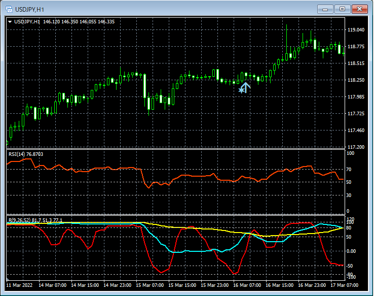 上図では説明の便宜上RCIとRSIを表示しておりますが、実際は本インジケーターを設置してもRCIとRSIは表示されません。