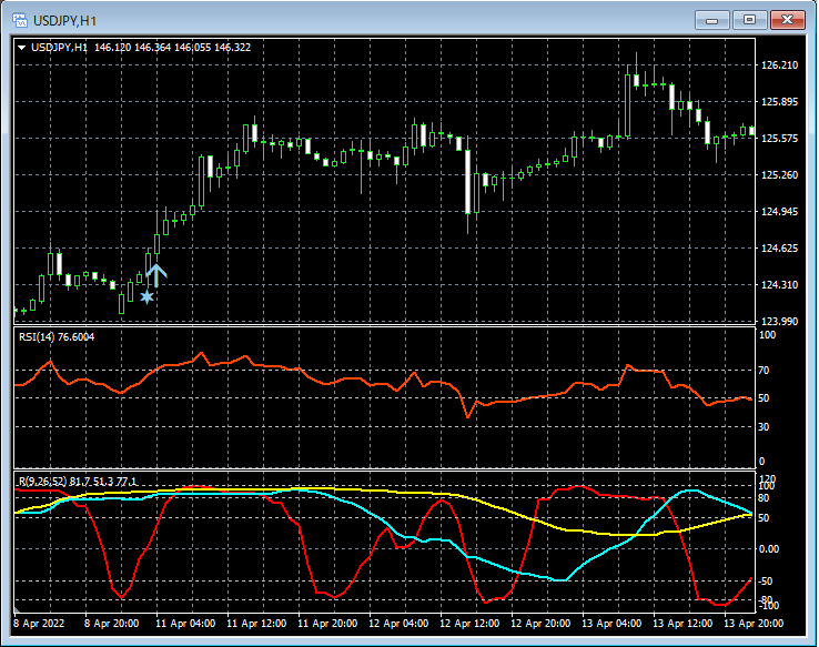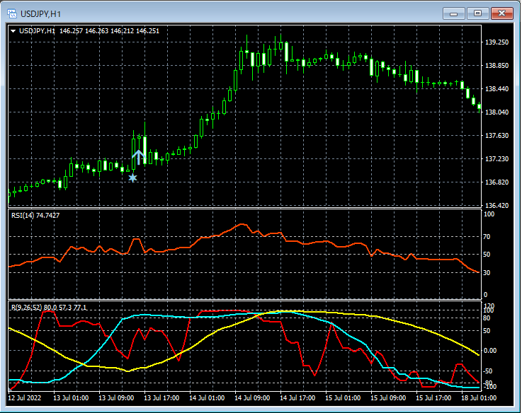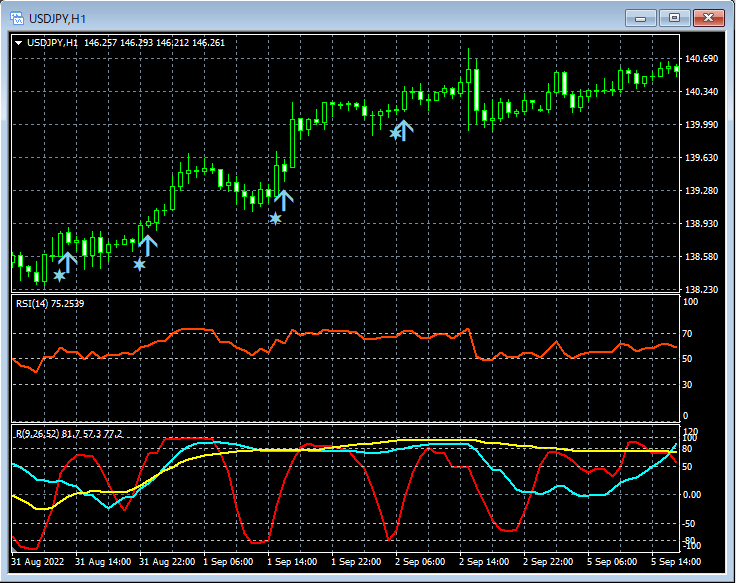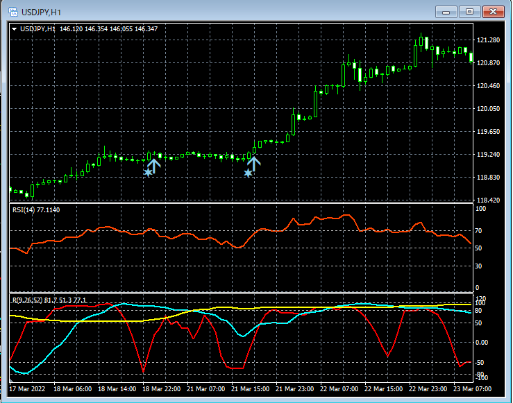 RCI3本ラインが上向きにそろっていない状態にあるローソク足の次のローソク足でRCI3本ラインの方向が上向きにそろった時に、RSIが50ラインより上にあるならば、空色(スカイブルー)の星印が点灯します。