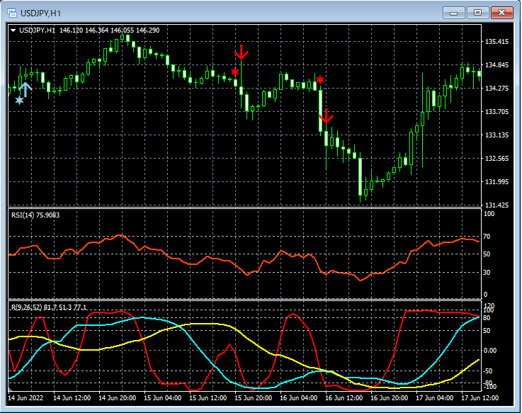 そして、あるローソク足の終値レベルで赤色の星印の点灯が確定すると、その次のローソク足の寄り付きと同時に赤色の矢印が点灯します。