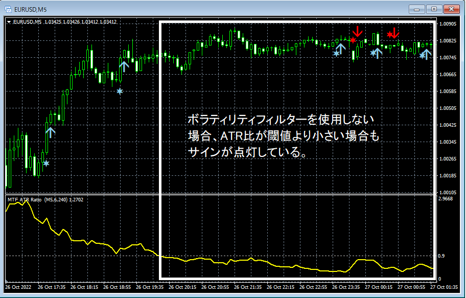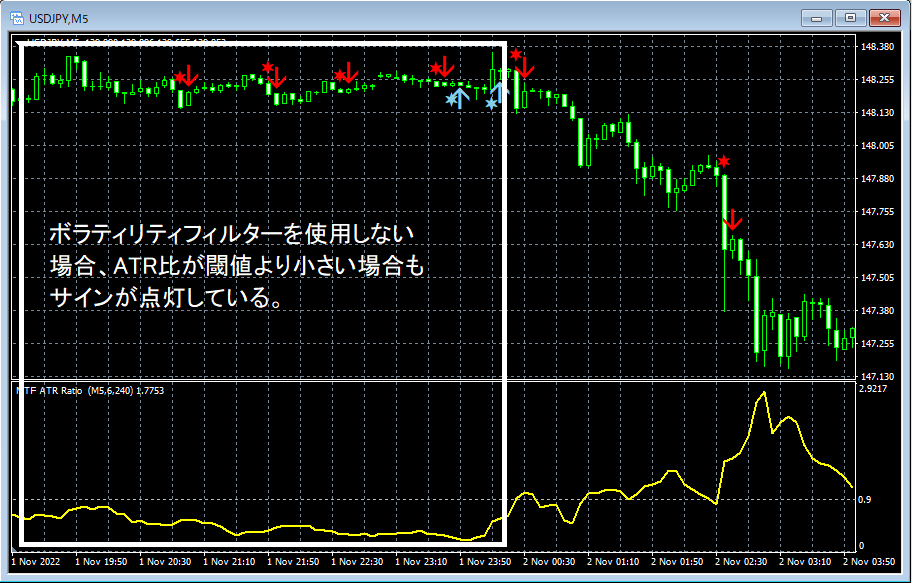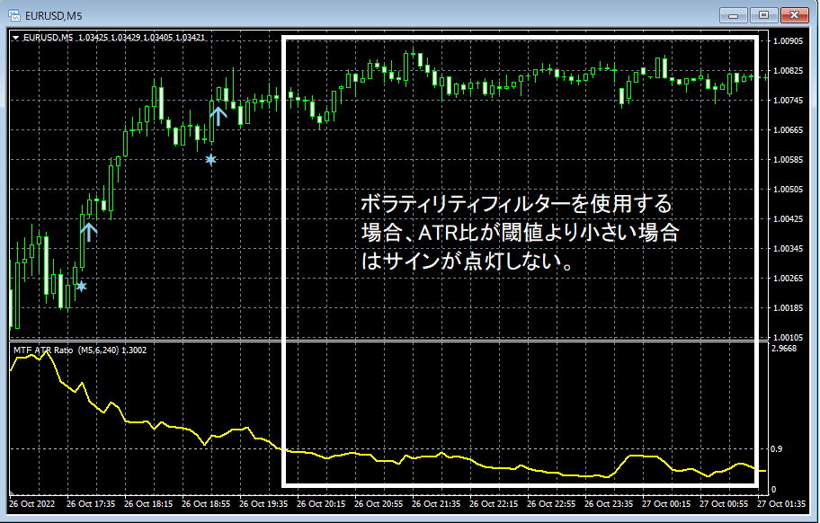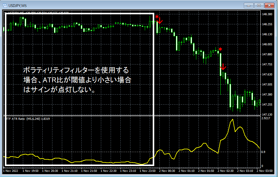 ボラティリティフィルターを利用する場合、ATR比が指定した閾値(ATR_Ratio_Level)より大きい場合のみサインが点灯します。