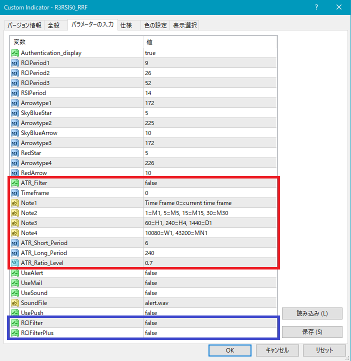 本商品に含まれるR3RSI50_RRF_XXXXXXXXX.ex4については、ボラティリティ(値動き)の小さな相場を避けることを目的として、ATR比を使ったマルチタイムフレーム対応のボラティリティフィルターが実装されています。