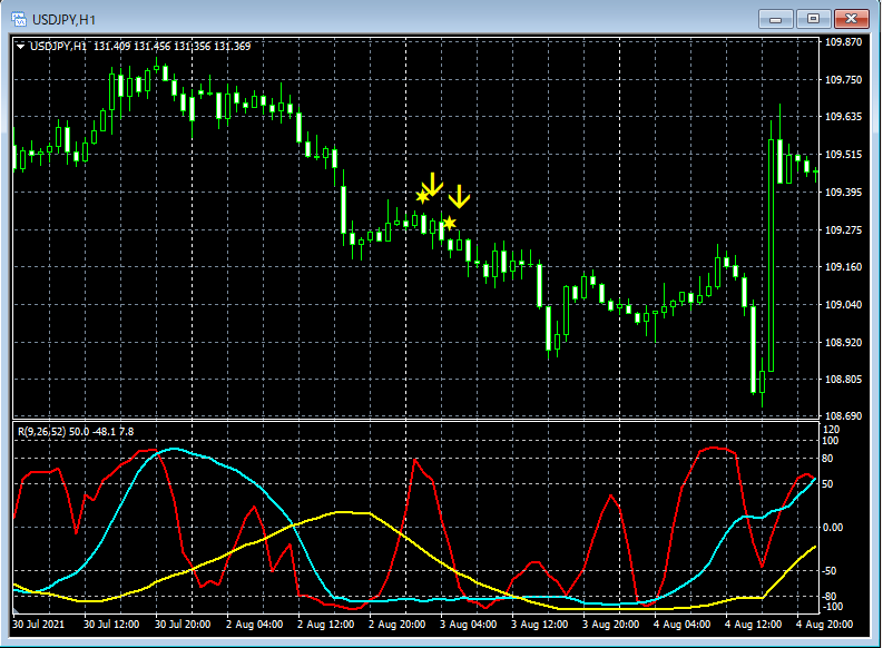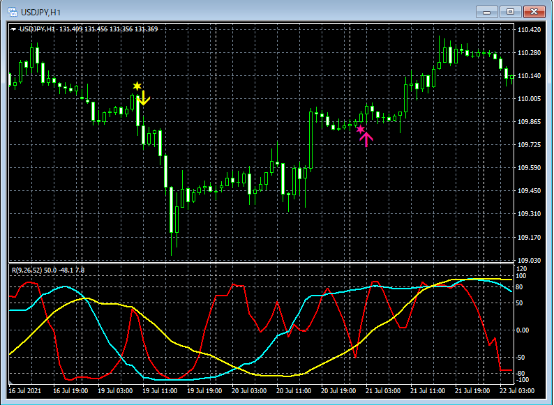 従来のインジケーターではフィルターとする平均足スムーズドが1本でしたが、追加インジケーターではフィルターとする平均足スムーズドが2本となっています。  すなわち、追加インジケーター【R3HAS2】では... (1) 上向き矢印について  RCI3本ラインが上向きにそろっていない状態にあるローソク足の次のローソク足でRCI3本ラインの方向が上向きにそろった時に、2本の平均足スムーズドがともに陽線ならば、ピンク色の星印が点灯します。 RCIFilterを使用している場合には、直前のローソク足における短期RCIの値がゼロより小さい場合のみピンク色の星印が点灯します。 RCIFilterPlusを使用している場合には、短期RCIが反転したことにより3本のRCIの方向が上向きにそろった場合のみピンク色の星印が点灯します。  そして、あるローソク足の終値レベルでピンク色の星印の点灯が確定すると、その次のローソク足の寄り付きと同時にピンク色の矢印が点灯します。 (2) 下向き矢印について  RCI3本ラインが下向きにそろっていない状態にあるローソク足の次のローソク足でRCI3本ラインの方向が下向きにそろった時に、2本の平均足スムーズドがともに陰線ならば、黄色の星印が点灯します。 RCIFilterを使用している場合には、直前のローソク足における短期RCIの値がゼロより大きい場合のみ黄色の星印が点灯します。 RCIFilterPlusを使用している場合には、短期RCIが反転したことにより3本のRCIの方向が下向きにそろった場合のみ黄色の星印が点灯します。  そして、あるローソク足の終値レベルで黄色の星印の点灯が確定すると、その次のローソク足の寄り付きと同時に黄色の矢印が点灯します。  上記のように、RCIFilterを使うことにより表示されるサインを絞ることができます。  ボラティリティフィルターを使うことによっても表示されるサインを絞ることができます。これについては後述します。 追加インジケーターのサインの例 上段: R3HAS2のサイン,平均足スムーズド 下段: RCI3本ライン ※本インジケーターには、RCIと平均足スムーズドを表示するインジケーターは同梱されておりませんのでご注意下さい。 上図では説明の便宜上RCIと平均足スムーズドを表示しておりますが、実際は本インジケーターを設置してもRCIと平均足スムーズドは表示されません。  この追加インジケーター【R3HAS2】の詳細については、下記の投資ナビ+の記事もご覧下さい。   https://www.gogojungle.co.jp/finance/navi/articles/32511