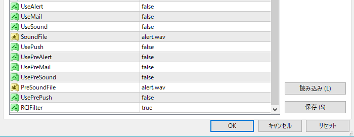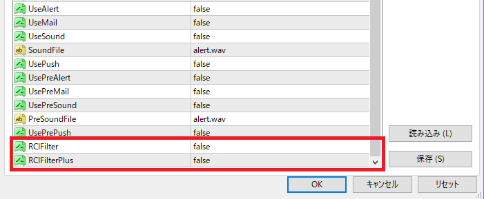 RCIFilter:  ひとつめのRCI関連のフィルターを使用する場合には true、使用しない場合には false を選択する。 RCIFilterPlus:  ふたつめのRCI関連のフィルターを使用する場合には true、使用しない場合には false を選択する。 (例えば、RCIの設定が初期値のままの場合、本フィルターを使用すると表示されるサインの数が著しく減少します。)