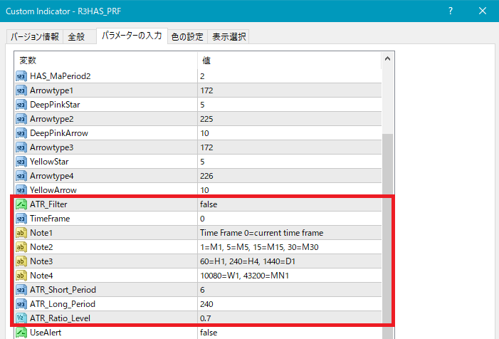 本商品には、ATR比(短期ATR/長期ATR)を表示するインジケーター MTF_ATR_Ratio_XXXXXXXX.ex4 が付属しています。 チャート例 サブウィンドウ:MTF_ATR_Ratio 設定項目について  下図の通り、"DLLの使用を許可する" にチェックを入れる必要があります。  本インジケーターは、MTF(マルチタイムフレーム)に対応しています。 TimeFrame:  表示するATR比を計算するタイムフレームを設定します。  現在のタイムフレームあるいはそれより上位の足(長期の足)を指定することができます。  現在のタイムフレームより下位の足(短期の足)を指定した場合は現在のタイムフレームを指定したことと同じことになります。  上図のNote1~Note4にあるように、TimeFrameの設定項目で指定できる値とタイムフレームとの対応は下記の通りです。例えば、1時間足を指定したい場合には60と入力します。   現在の足: 0   1分足:   1   5分足:   5   15分足:  15   30分足:  30   1時間足: 60   4時間足: 240   日足:  1440   週足: 10080   月足: 43200 ATR_Long_Period:  長期ATRの期間を設定します。 ATR_Short_Period:  短期ATRの期間を設定します。