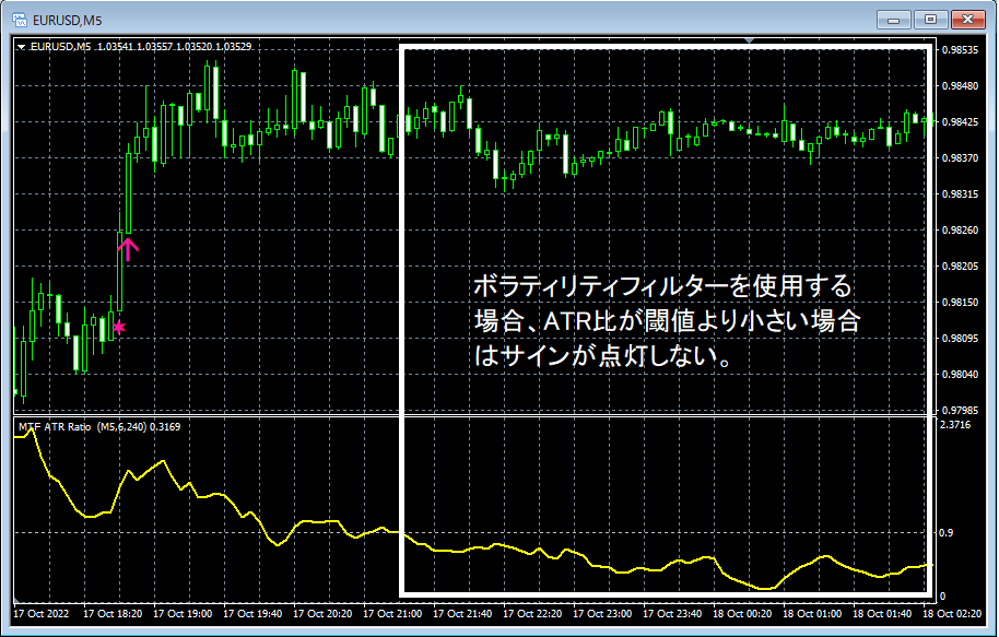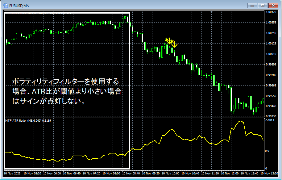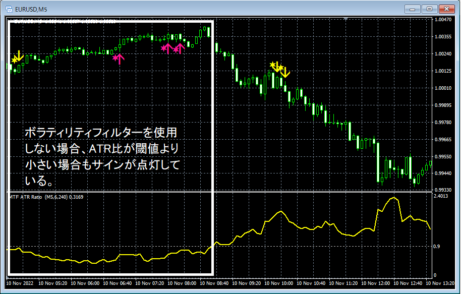 本商品に含まれる矢印インジケーターについては、ボラティリティ(値動き)の小さな相場を避けることを目的として、ATR比を使ったマルチタイムフレーム対応のボラティリティフィルターが実装されています。  ボラティリティフィルターを利用する場合、ATR比が指定した閾値(ATR_Ratio_Level)より大きい場合のみサインが点灯します。  ATR比短期ATR/長期ATR で定義される値です。  上図で赤い枠で囲った項目がATR比を使ったボラティリティフィルターの設定項目となっています。  MTF(マルチタイムフレーム)に対応しています。 ATR_Filter:  ボラティリティフィルターを使用する場合には true、使用しない場合には false を選択する。 TimeFrame:  フィルターに使うATR比を計算するタイムフレームを設定します。  現在のタイムフレームと同じタイムフレームあるいはそれより上位の足(長期の足)を指定することができます。  現在のタイムフレームより下位の足(短期の足)を指定した場合は現在のタイムフレームを指定したことと同じことになります。  上図のNote1~Note4にあるように、TimeFrameの設定項目で指定できる値とタイムフレームとの対応は下記の通りです。例えば、1時間足を指定したい場合には60と入力します。   現在の足: 0   1分足:   1   5分足:   5   15分足:  15   30分足:  30   1時間足: 60   4時間足: 240   日足:  1440   週足: 10080   月足: 43200 ATR_Long_Period:  長期ATRの期間を設定します。 ATR_Short_Period:  短期ATRの期間を設定します。 ATR_Ratio_Level:  ATR比が指定した閾値(ATR_Ratio_Level)より大きい場合のみサインが点灯します。 上記の各設定項目における設定値については、ユーザ様それぞれの手法,通貨ペアやタイムフレーム,その時々における相場状況などに応じてお好みの設定でご利用下さい。 チャート例 ボラティリティフィルターなし (ATR_Filter = false) ボラティリティフィルターあり (ATR_Filter = true, TimeFrame = 0, ATR_Long_Period = 240, ATR_Short_Period = 6, ATR_Ratio_Level = 0.9) ボラティリティフィルターなし (ATR_Filter = false) ボラティリティフィルターあり (ATR_Filter = true, TimeFrame = 0, ATR_Long_Period = 240, ATR_Short_Period = 6, ATR_Ratio_Level = 0.9)