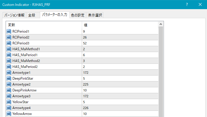 下図の通り、"DLLの使用を許可する" にチェックを入れる必要があります。 星印や矢印の発生条件に関する設定項目  上図の通り、3本のRCIの期間の設定と平均足スムーズドの設定をする必要があります。    RCI関連     RCIPeriod1 : 短期RCIの期間 (初期設定では 9)     RCIPeriod2 : 中期RCIの期間 (初期設定では 26)     RCIPeriod3 : 長期RCIの期間 (初期設定では 52)    平均足スムーズド関連     HAS_MaMethod1 : (第1段階の)移動平均の方法 (初期設定では 2)     HAS_MaPeriod1 : (第1段階の)移動平均の期間 (初期設定では 6)     HAS_MaMethod2 : (第2段階の)移動平均の方法 (初期設定では 3)     HAS_MaPeriod2 : (第2段階の)移動平均の期間 (初期設定では 2)    移動平均の方法     0:単純移動平均線(SMA,Simple MA)     1:指数平滑移動平均(EMA,Exponential MA)     2:平滑移動平均線(SMMA,Smoothed MA)     3:線形加重移動平均線(LWMA,Liner Weighted MA) ※追加インジケーター【R3HAS2】の場合には、下記の通り、平均足スムーズド関連として、2本の平均足スムーズドについて設定する必要があります。    平均足スムーズド関連     1本目の平均足スムーズド      HAS1_MaMethod1 : (第1段階の)移動平均の方法 (初期設定では 2)      HAS1_MaPeriod1 : (第1段階の)移動平均の期間 (初期設定では 6)      HAS1_MaMethod2 : (第2段階の)移動平均の方法 (初期設定では 3)      HAS1_MaPeriod2 : (第2段階の)移動平均の期間 (初期設定では 2)     2本目の平均足スムーズド      HAS2_MaMethod1 : (第1段階の)移動平均の方法 (初期設定では 2)      HAS2_MaPeriod1 : (第1段階の)移動平均の期間 (初期設定では 24)      HAS2_MaMethod2 : (第2段階の)移動平均の方法 (初期設定では 3)      HAS2_MaPeriod2 : (第2段階の)移動平均の期間 (初期設定では 8) 星印や矢印の表示位置に関する設定項目  星印や矢印の表示位置がローソク足に近すぎて見にくかったり、逆に遠すぎて場合によっては表示位置が画面外になってしまう場合もあります。これらの印を表示する高さを、下記の設定項目の値を調整することにより、修正することができます。値が大きいほど表示位置はローソク足から離れていきます。    (初期設定ではピンク色の)星印 → DeepPinkStar    (初期設定ではピンク色の)矢印 → DeepPinkArrow    (初期設定では黄色の)星印 → YellowStar    (初期設定では黄色の)矢印 → YellowArrow  また、下記の項目の値を変更することにより、星印や矢印の形状を変更することができます。    (初期設定ではピンク色の)星印 → Arrowtype1    (初期設定ではピンク色の)矢印 → Arrowtype2    (初期設定では黄色の)星印 → Arrowtype3    (初期設定では黄色の)矢印 → Arrowtype4  なお、星印や矢印あるいはその代わりとして使用できる記号とそれに対応する番号は下表の通りです。 アラートに関する設定項目 (1)矢印サイン点灯時のアラートについて UseAlert:  下図のようなアラートダイアログによりサイン発生を知らせる機能を使用する場合には true、使用しない場合には false を選択する。 UseMail:  メールによりサイン発生を知らせる機能を使用する場合には true、使用しない場合には false を選択する。 UseSound:  アラート音によりサイン発生を知らせる機能を使用する場合には true、使用しない場合には false を選択する。 SoundFile:  アラート音に使うサウンドのファイル名を入力する。 UsePush:  プッシュ通知によりサイン発生を知らせる機能を使用する場合には true、使用しない場合には false を選択する。 (2)星印サイン初回点灯時のアラートについて UsePreAlert:  アラートダイアログによりサイン発生を知らせる機能を使用する場合には true、使用しない場合には false を選択する。 UsePreMail:  メールによりサイン発生を知らせる機能を使用する場合には true、使用しない場合には false を選択する。 UsePreSound:  アラート音によりサイン発生を知らせる機能を使用する場合には true、使用しない場合には false を選択する。 PreSoundFile:  アラート音に使うサウンドのファイル名を入力する。 UsePrePush:  プッシュ通知によりサイン発生を知らせる機能を使用する場合には true、使用しない場合には false を選択する。 メールによりサイン発生を知らせる機能を使用する場合のMT4側の設定の一例 ツール → オプション → E-メール イメージ図 ※設定後にMT4を再起動させる必要があるようです。