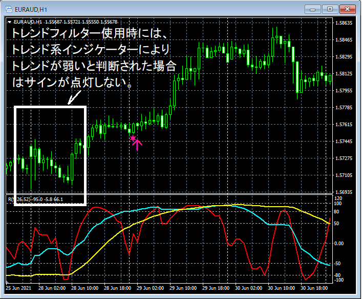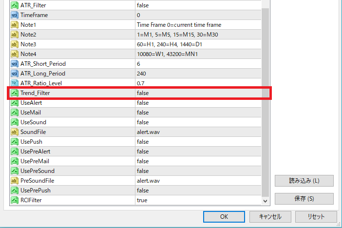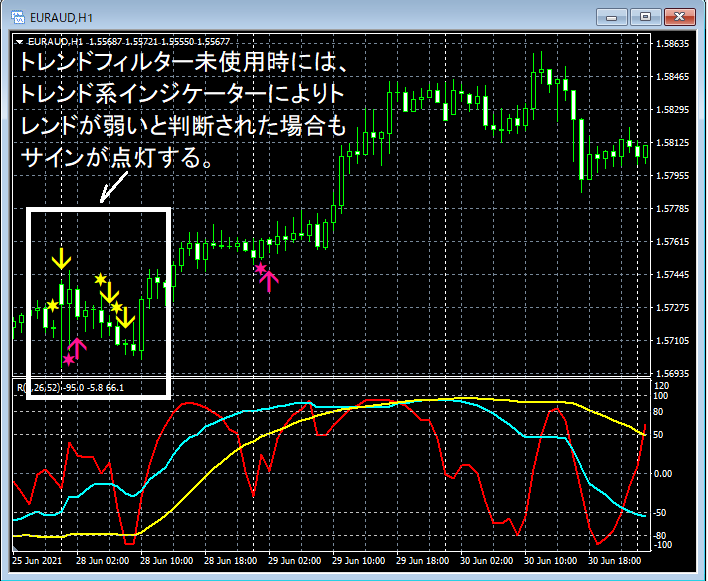 本商品に含まれる矢印インジケーターについては、トレンド系インジケーターによりトレンドの強弱を判定してサインの取捨選択を行うトレンドフィルターが実装されています。  上図で赤い枠で囲った項目がトレンドフィルターの設定項目となっています。 Trend_Filter:  トレンドフィルターを使用する場合には true、使用しない場合には false を選択する。 チャート例 トレンドフィルターなし (Trend_Filter = false) トレンドフィルターあり (Trend_Filter = true)