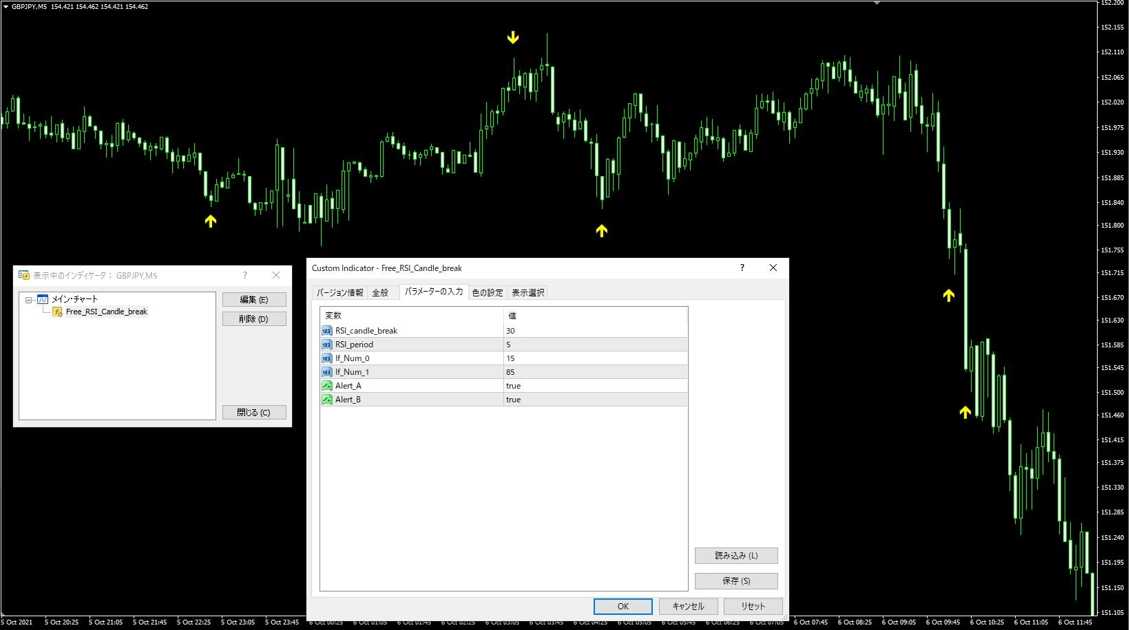 【戦 略】 直近の指定したローソク足本数の期間で終値の高値または安値ブレークとRSIの設定数値ブレイク時、サインでます。