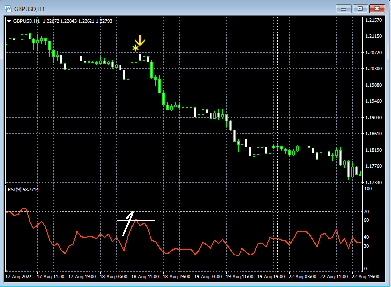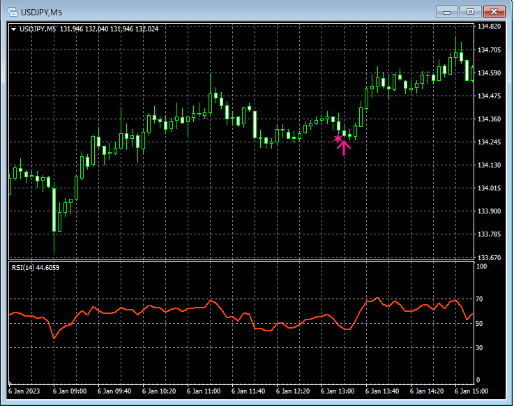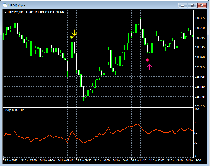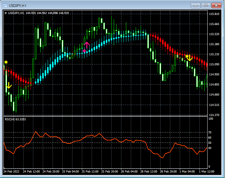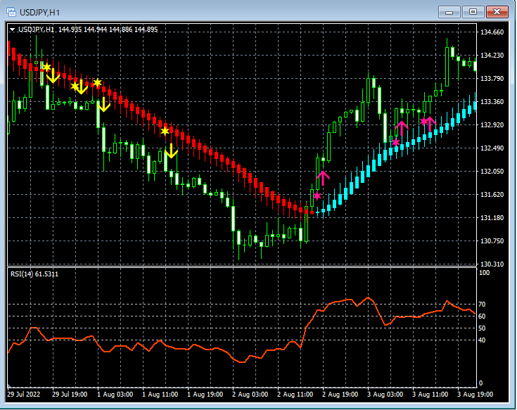 RSIが売りレベルを上抜けした時に、平均足スムーズドが陰線ならば、黄色の星印が点灯します。