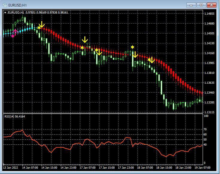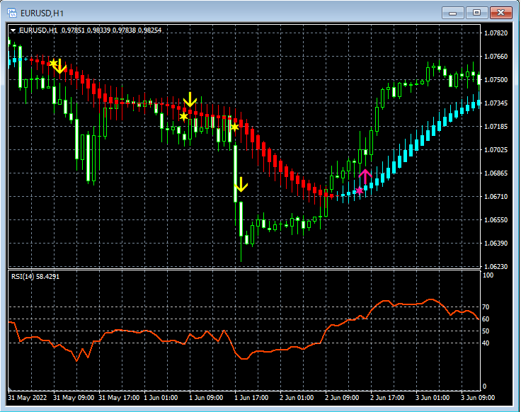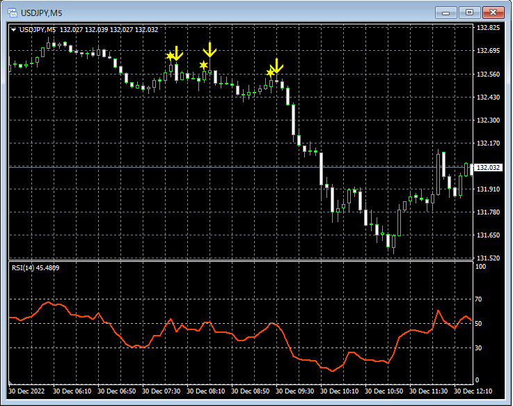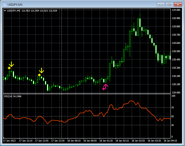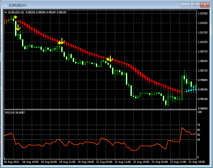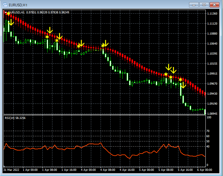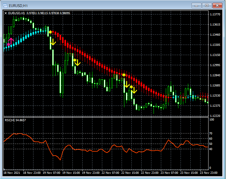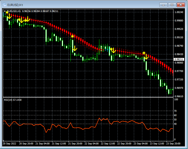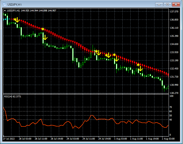 RSIが売りレベルを下抜けした時に、2本の平均足スムーズドが陰線ならば、黄色の星印が点灯します。
