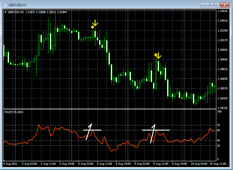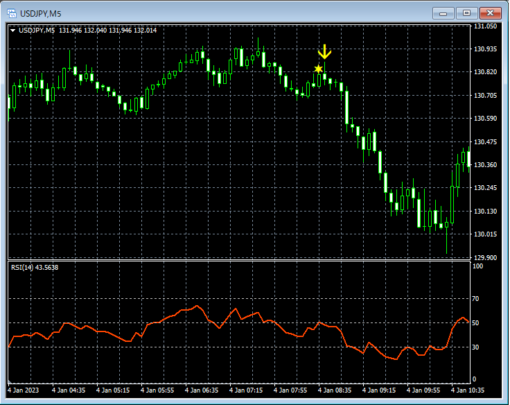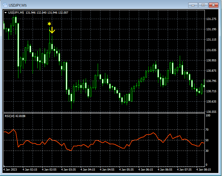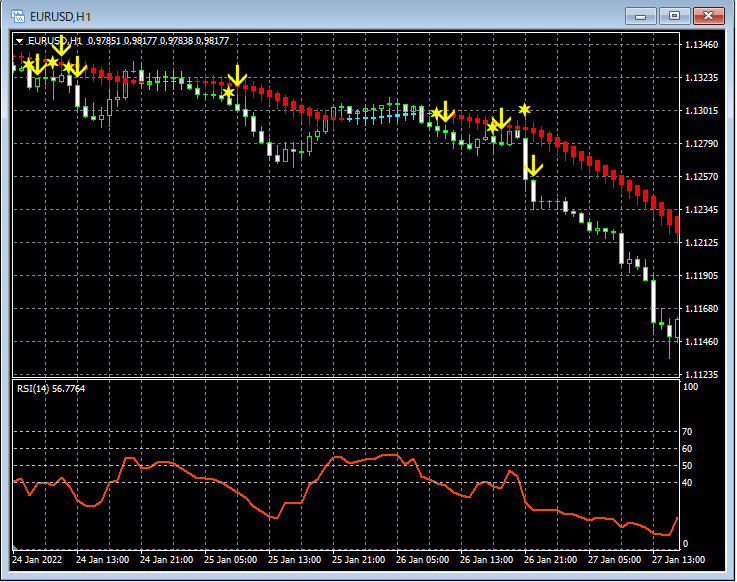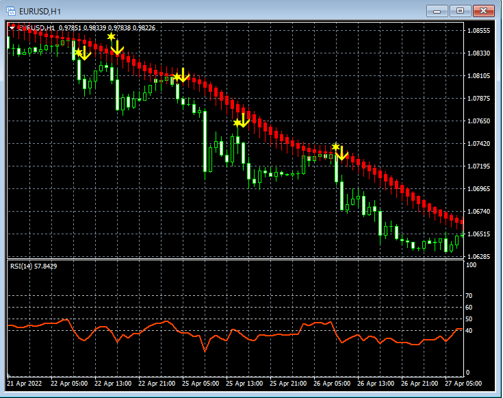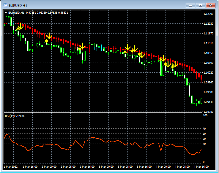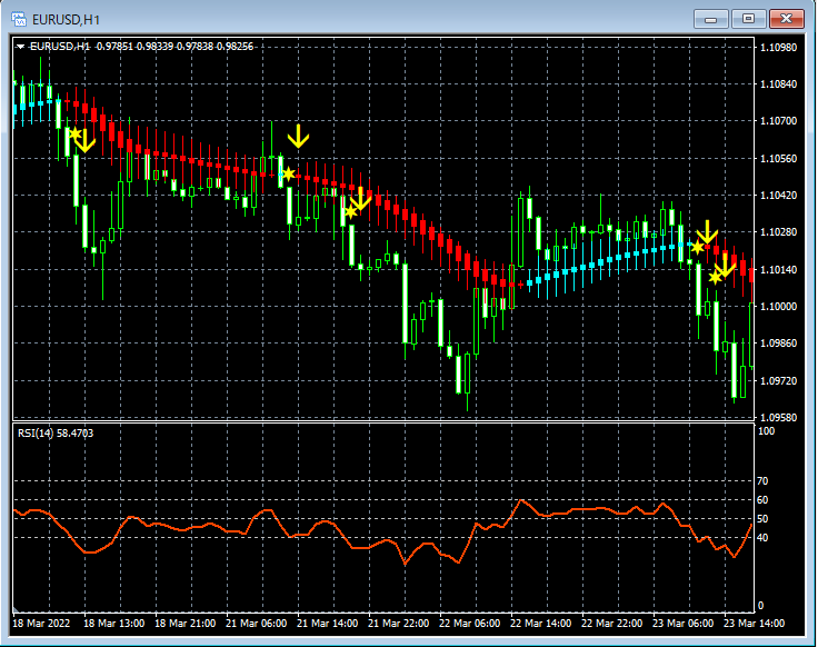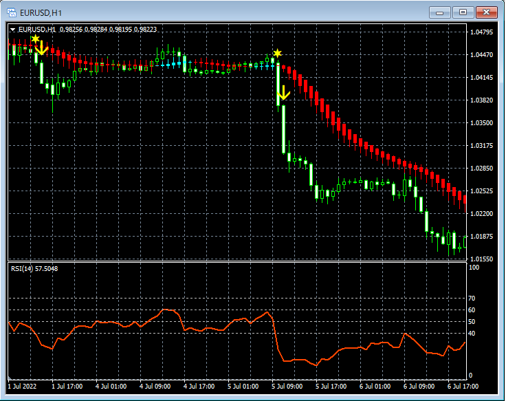 RSIが売りレベルを下抜けした時に、2本の平均足スムーズドが陰線ならば、黄色の星印が点灯します。