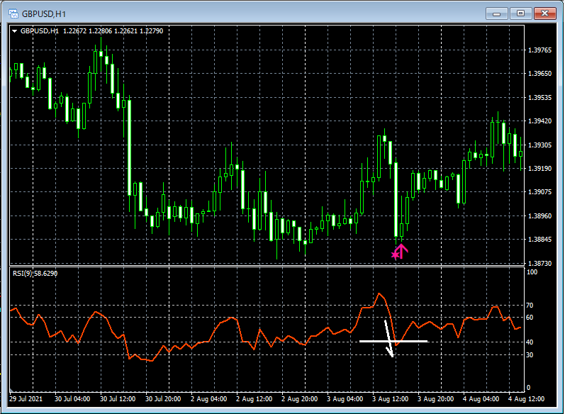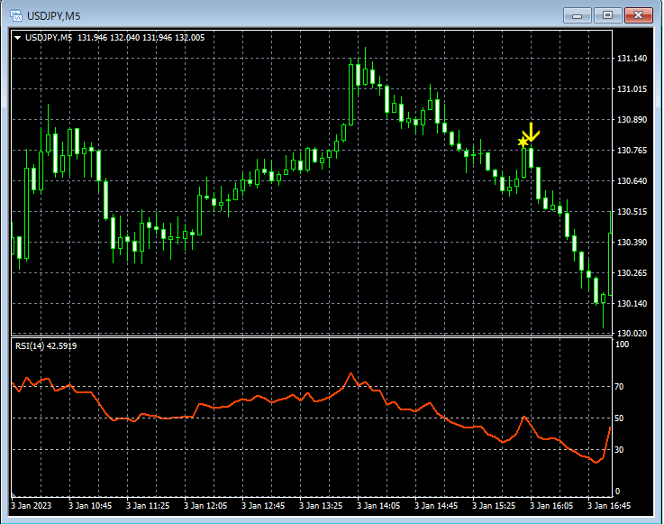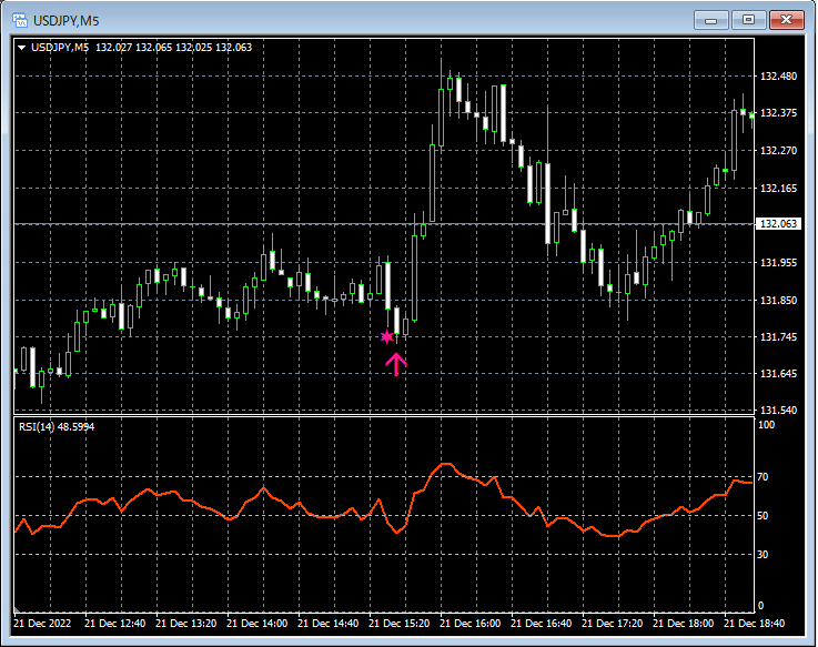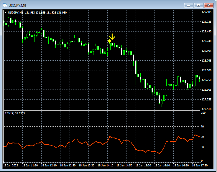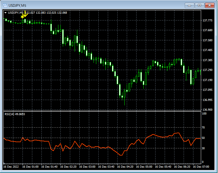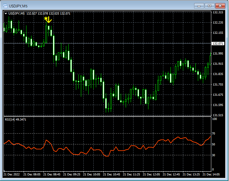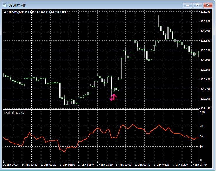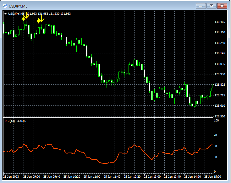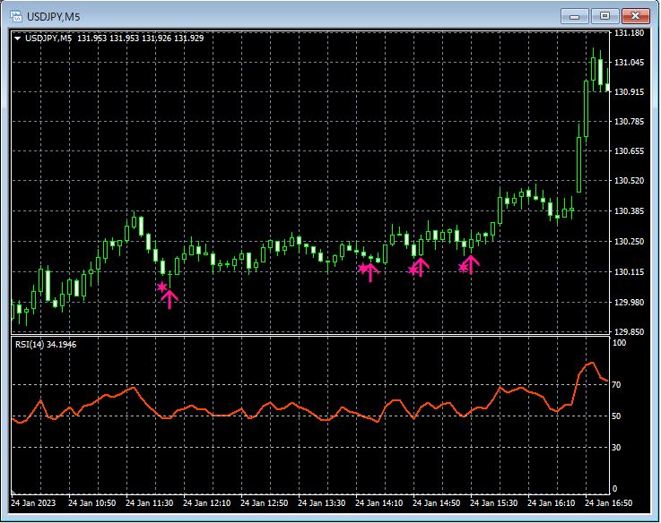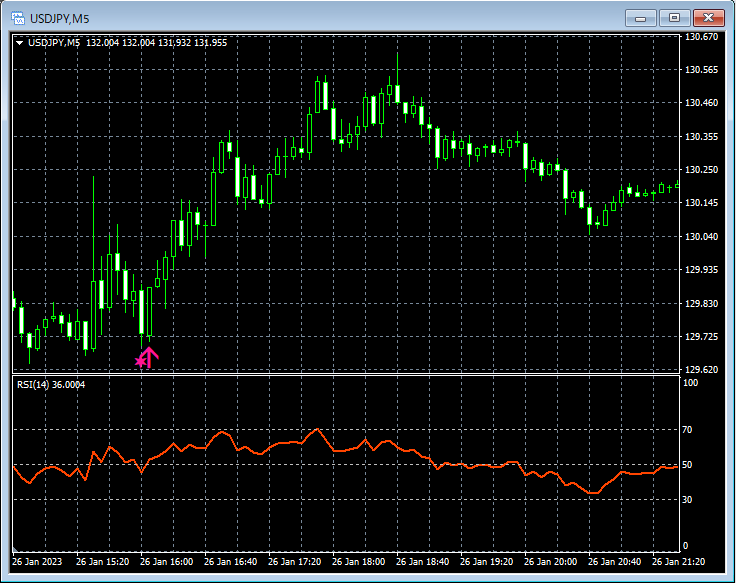 上図では説明の便宜上RSIを表示しておりますが、実際は本インジケーターを設置してもRSIは表示されません。