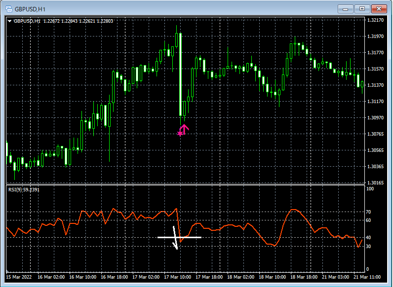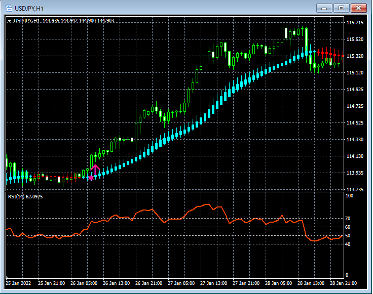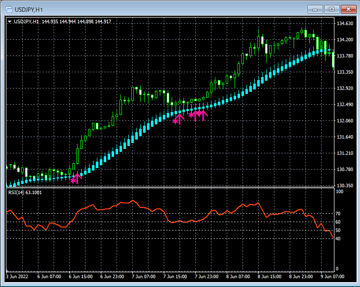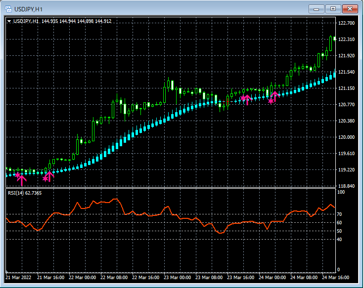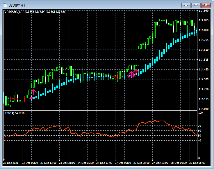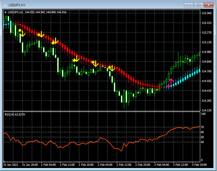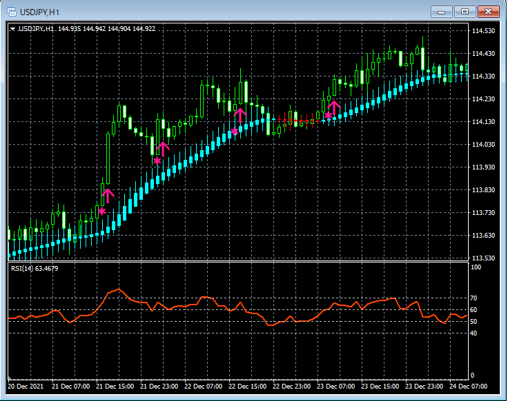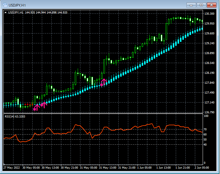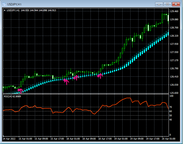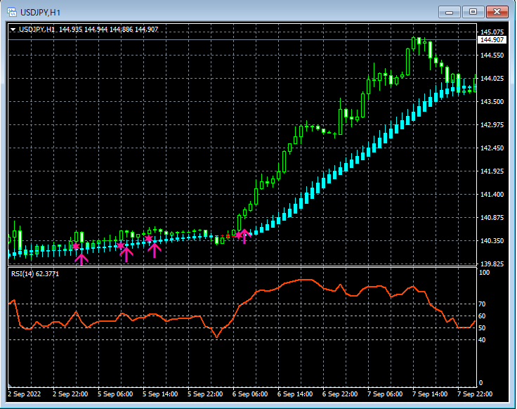【RSIHAS1】のサインの例(ドル円1時間足,設定を変更したもの) 2022年10月3日追加
