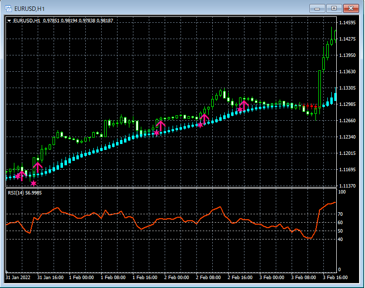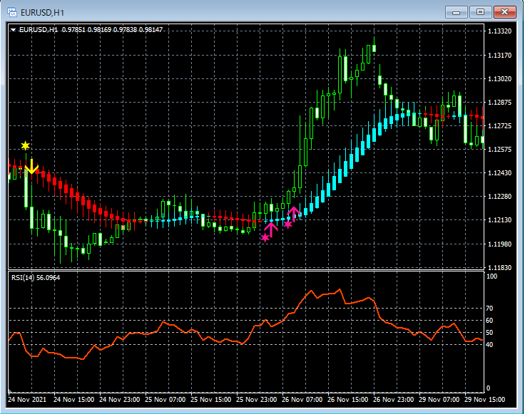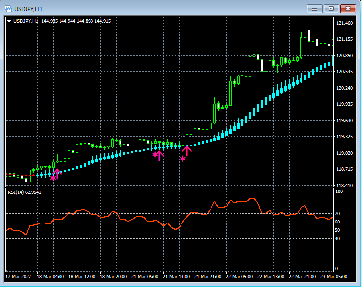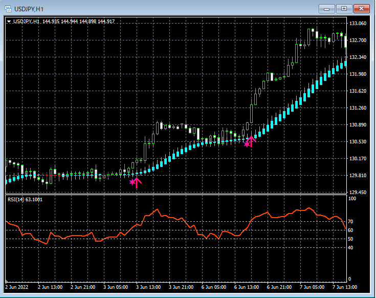 RSIが買いレベルを上抜けした時に、2本の平均足スムーズドが陽線ならば、ピンク色の星印が点灯します。