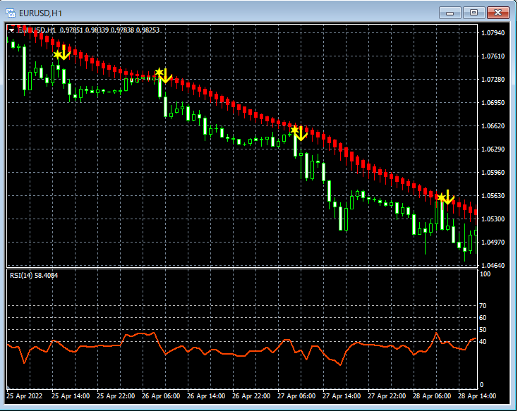 通常版:RSIが売りレベルを下抜けした時点で平均足スムーズドが陰線ならば下向き矢印点灯
