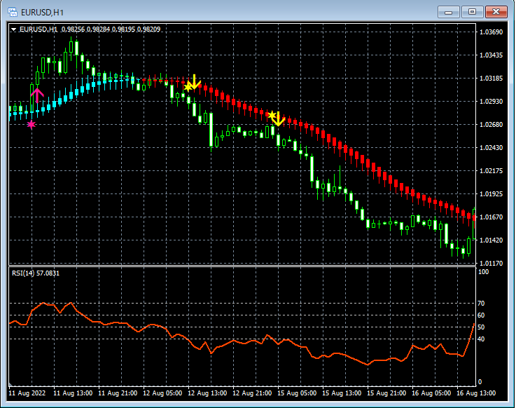 【RSIHAS1】のサインの例(ユーロドル1時間足,設定を変更したもの) 2022年10月3日追加
