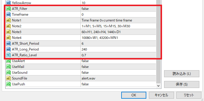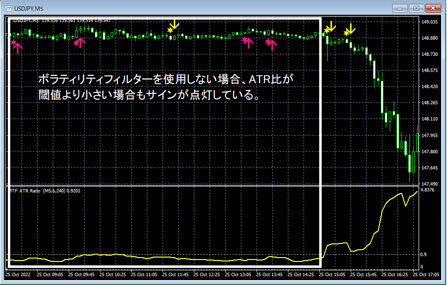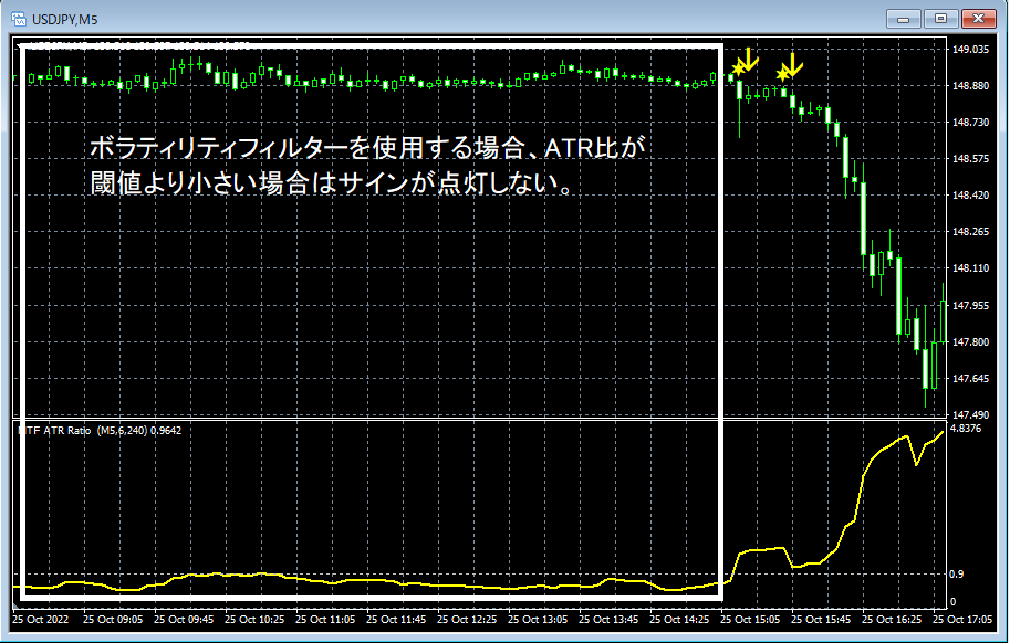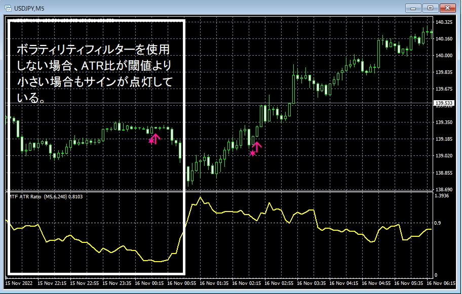 ボラティリティフィルターを利用する場合、ATR比が指定した閾値(ATR_Ratio_Level)より大きい場合のみサインが点灯します。