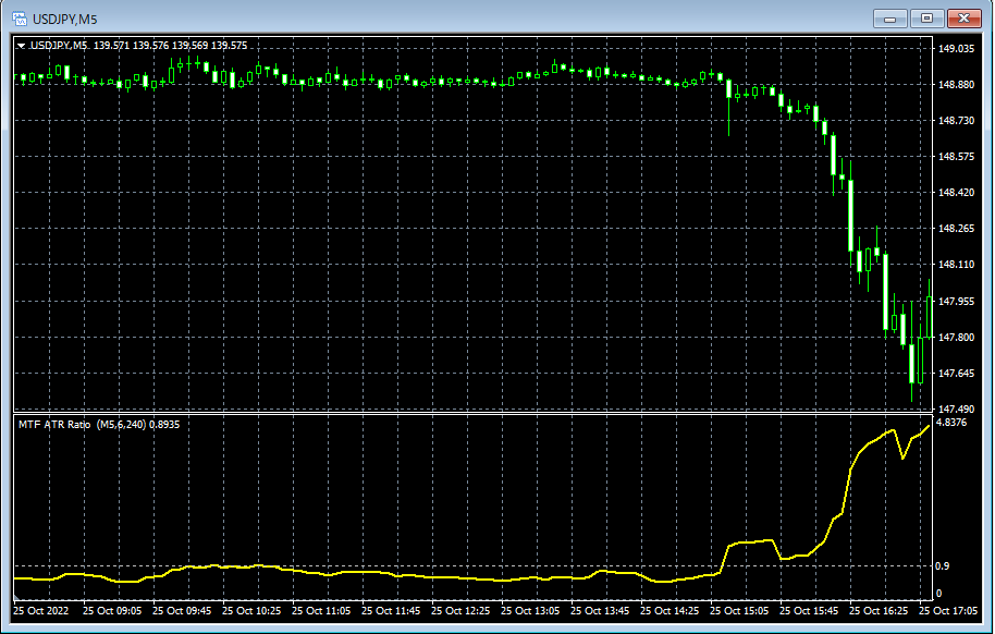 本商品には、ATR比(短期ATR/長期ATR)を表示するインジケーター MTF_ATR_Ratio_XXXXXXXX.ex4 が付属しています。