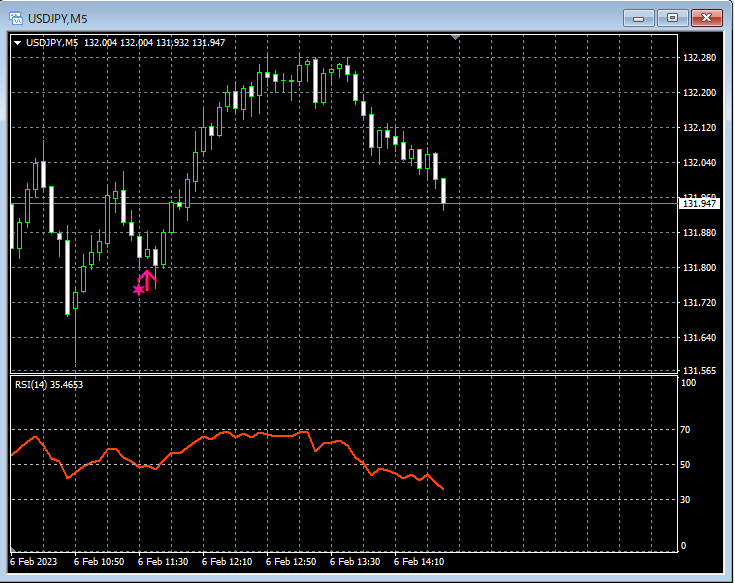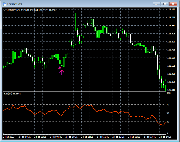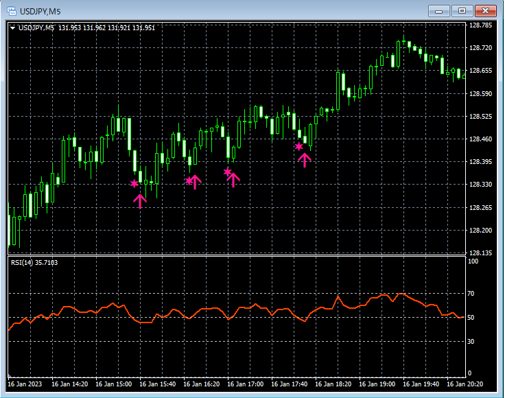 RSIが買いレベルを下抜けした時に、平均足スムーズドが陽線ならば、ピンク色の星印が点灯します。