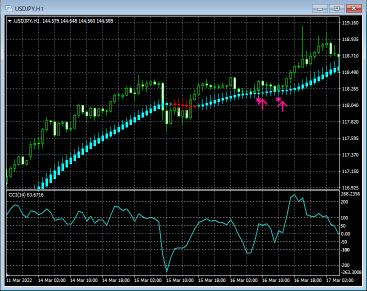 CCIが買いレベルを下抜けした時に、2本の平均足スムーズドが陽線ならば、ピンク色の星印が点灯します。