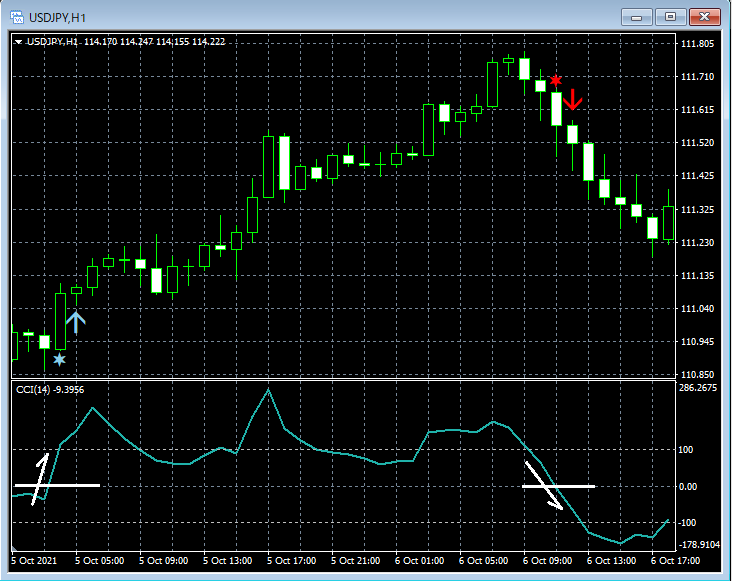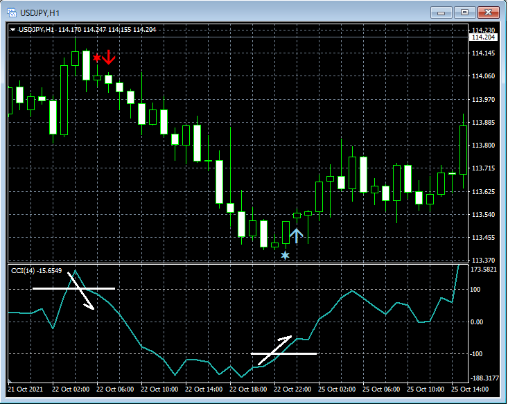 CCIが設定ライン(任意に設定可能)を上抜けすると空色(スカイブルー)の星印が点灯します。  そして、あるローソク足の終値レベルで空色(スカイブルー)の星印の点灯が確定すると、その次のローソク足の寄り付きと同時に空色(スカイブルー)の矢印が点灯します。  CCIが設定ライン(任意に設定可能)を下抜けすると赤色の星印が点灯します。  そして、あるローソク足の終値レベルで赤色の星印の点灯が確定すると、その次のローソク足の寄り付きと同時に赤色の矢印が点灯します。 CCICrossUpPoint = 0.0,CCICrossDownPoint = 0.0 上段: CCIzero(CCICrossUpPoint = 0.0,CCICrossDownPoint = 0.0) 下段: CCI(14) CCICrossUpPoint = -100.0,CCICrossDownPoint = 100.0 上段: CCIzero(CCICrossUpPoint = -100.0,CCICrossDownPoint = 100.0) 下段: CCI(14) ※本インジケーターにCCIを表示するインジケーターは同梱されておりませんのでご注意下さい。 (なお、CCIはMT4に標準搭載されております。) 矢印や星印の表示の設定を変更して下図のような表示にすることも可能です。