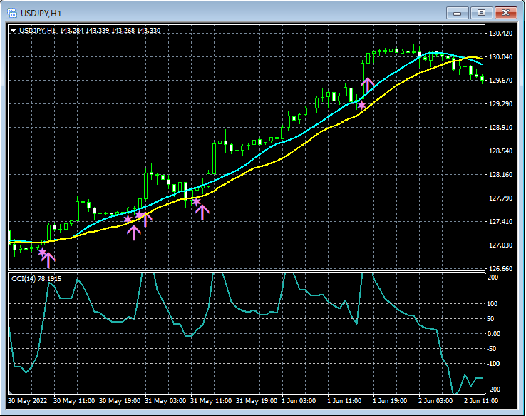 CCIが3段階判定により売られ過ぎラインを上抜けてきたと判定されたときに、2本の移動平均線の向きが上向きならばバイオレット色の星印が点灯します。