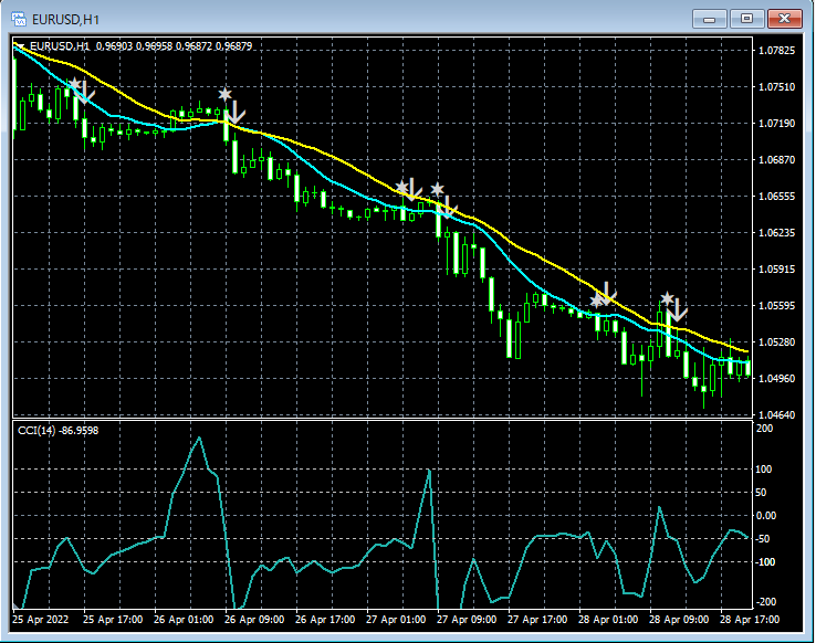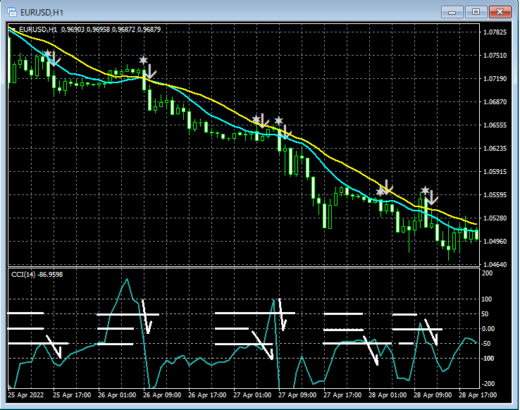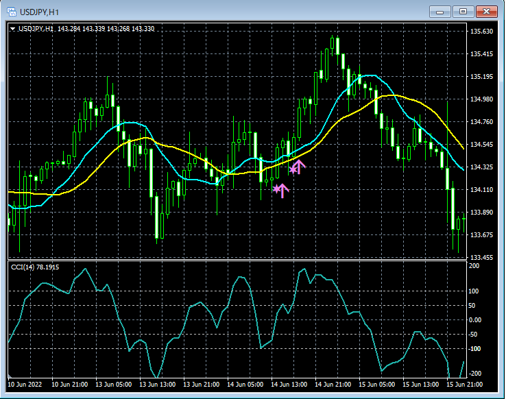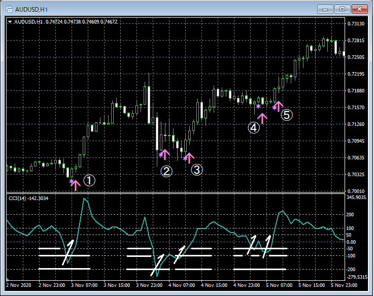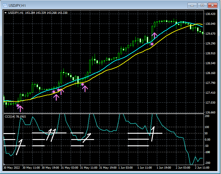 ※上のチャートでは説明の便宜上CCIを表示しておりますが、本インジケーター【CCIS3】には、CCIを表示するインジケーターは同梱されておりませんのでご注意下さい。