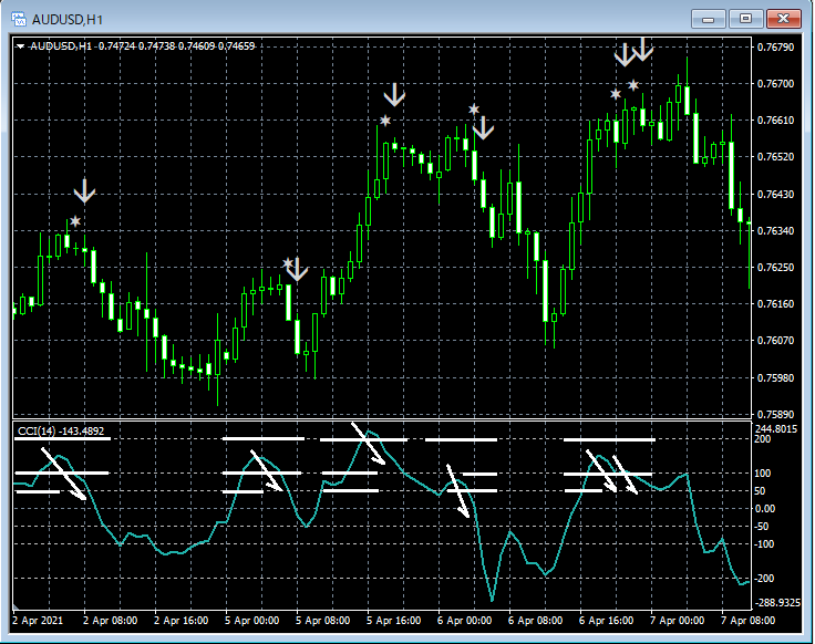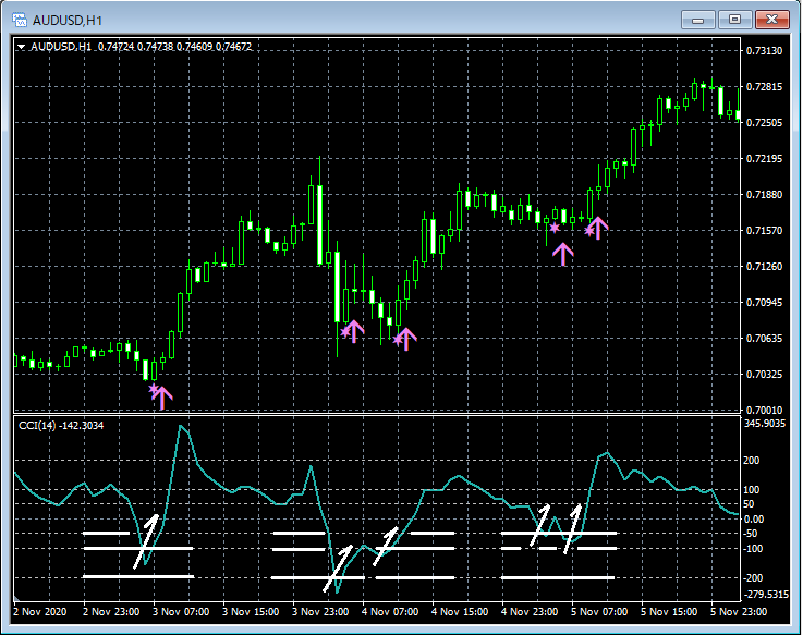 CCIの買われ過ぎライン(売られ過ぎライン)を例えば+100(-100)に設定して、このラインにCCIが到達して反転したら売ろう(買おう)と思っていたのに、+100(-100)に到達せずに反転してしまってチャンスを逃したことはありませんか?