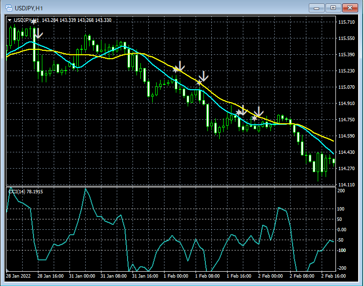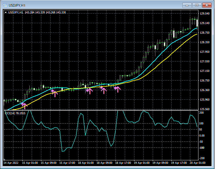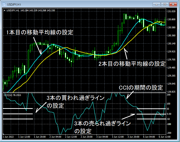 フィルター2:価格が2本の移動平均線の上下どちらにあるかに着目してエントリー方向を判断し、CCIでエントリータイミングをはかっています。(移動平均線をフィルターに使用しないものも付属しています。)