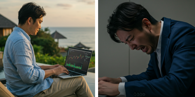 もう、必死で、血の滲むような努力でチャートを分析しても、1ミリも報われない。 あの精神がゴリゴリ削られるだけの、地獄のようなトレーダー生活から 今すぐ、この瞬間、抜け出しましょう。