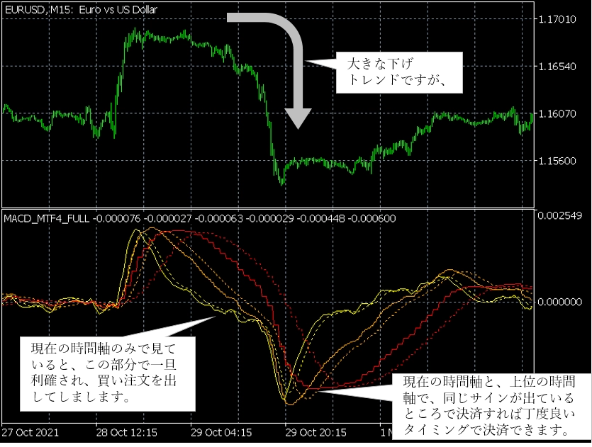 この売り買いシグナルをマルチタイムフレームで分析することにより、現在の時間軸のインジケータのみの判断ではだましが発生する場合でも、上位の時間軸も合わせて判断することでだましを回避することができます。