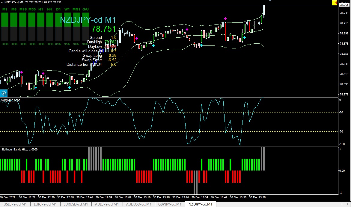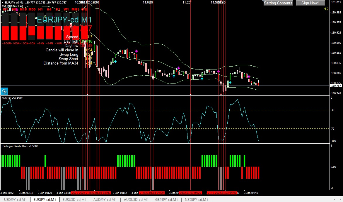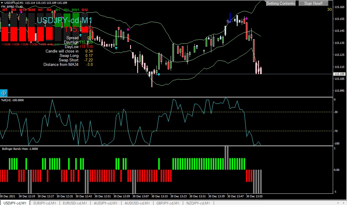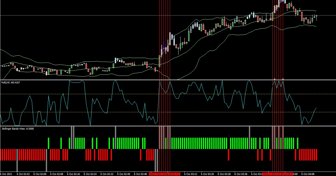 ③Bollinger Bands Histoのバーが赤帯もしくはグレー帯になっていること。