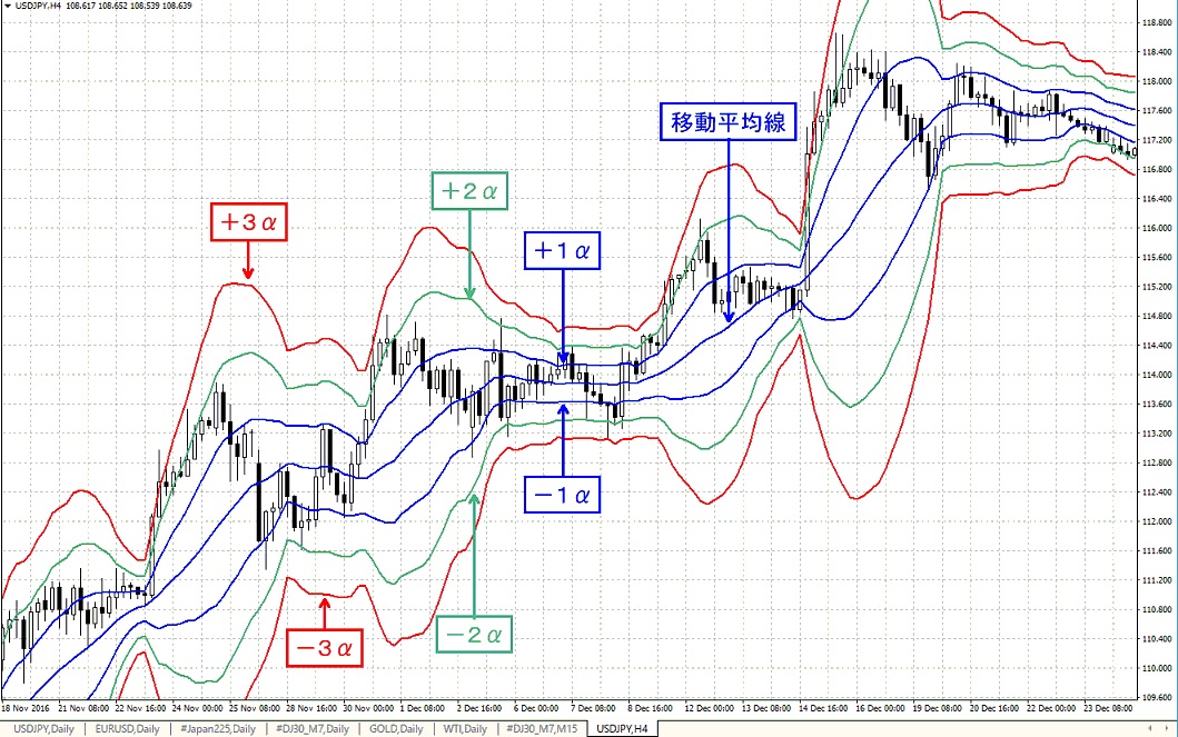 そのため、普通は、基準値、±2σの3本ラインで表示されたボリンジャーバンドが使用されます。チャート上にボリンジャーバンドを表示しておくと±2σ内で価格が収まっているかをもとに「これからどのように価格が変動するのか」を判断できます。