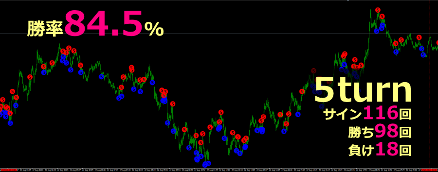 エントリーするロウソク足の1本前のロウソク足が形成中にサインが鳴りますので、その時点でエントリーの準備をしておいてください。