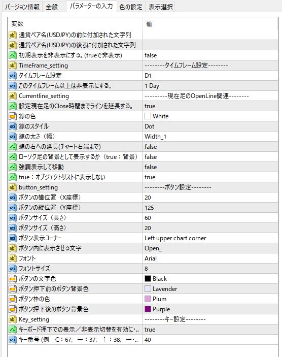 当インジケーターは、上位タイムフレームの始値ラインを、上位タイムフレームローソク足のクローズする時間までラインを延長して表示させることができるインジケーターです。 また、インジケーターの表示そのものをボタンかキー押下でオン・オフする機能も搭載しています。 始値はトレードにおいて意識されるラインです。それにお気づきの方も多いかと思います。 私も始値は必ず確認しますが、その際、通常の始値表示インジケーターですと、横軸において現在足の位置までしかラインが描画されないものがほとんどかと思います。 それだと、表示させている上位始値の足が更新された直後などは、ラインが極端に短く、とてもわかりづらいです。 また、始値ラインをクローズ時間まで延長させることにより、あとどのくらいで今の足が終わるのかが視覚的にわかりやすくなり、トレードプランが立てやすくなると思います。 当インジケーターは、私が出品させていただいている他のMTFインジケーターと同様、設定する始値のタイムフレームを変えることにより、一つのチャートに複数設置することができます。 例えば5分足チャートに1時間足や4時間足の始値を同時に表示させることも可能です。 (その際は、ボタンの位置を設定で変更していただければ、ボタンも別々に表示できます。)また、こちらのインジケーターは、チャート適用時とタイムフレーム切替時に初めから非表示とすることができます。 パラメーター設定で、通常モード(最初から表示状態)と選択できるようにしていますので、普段は素のチャートを見ることが多い方、始値の状況を見るのはエントリー前だけ、というような使い方をされる方は、初期状態で非表示モードを選択されると便利かと思います。