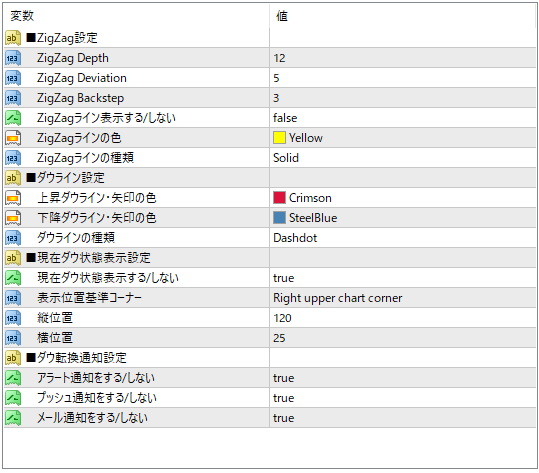 1.特徴  ・本インジケータはMT4用のインジケータです。  ・ダウ理論の切り替わりや状態、ダウの軌跡をチャート上に表示します。  ・ダウ転換時には通知することができます。  ・ダウ理論の判定方法はZigZagにて判断します。  ・通知の種類は3種類(MT4の標準機能によるもの)   ①MT4アラート通知   ②スマホアプリへのプッシュ通知   ③メール通知 2.表示内容