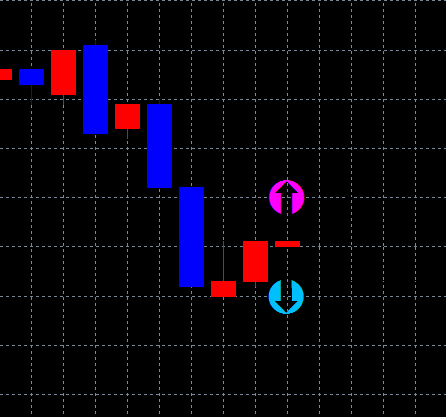 ↑変動中のローソク足の始値から上下に記号が表示されます。これは、特殊な方法でエントリーする時にHIGH/LOW(陽線か陰線か)を選択するために使用する記号になります。