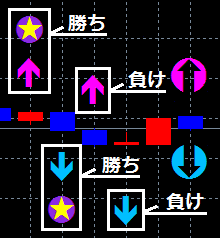 ↑エントリー結果情報は、選択矢印と勝ちシンボルがチャート画面に表記されるので、いつどんなサインでどんなチャート状況でどのローソク足にエントリーしたのかが一目瞭然に分かる仕様です。